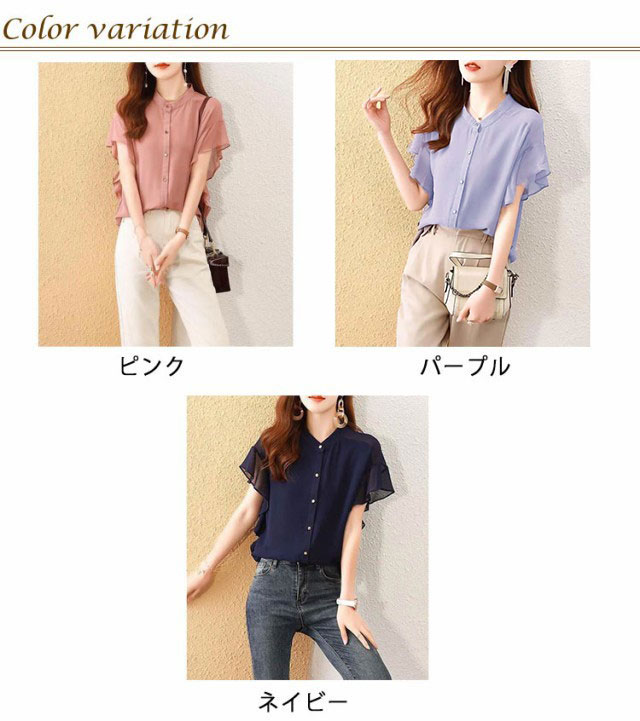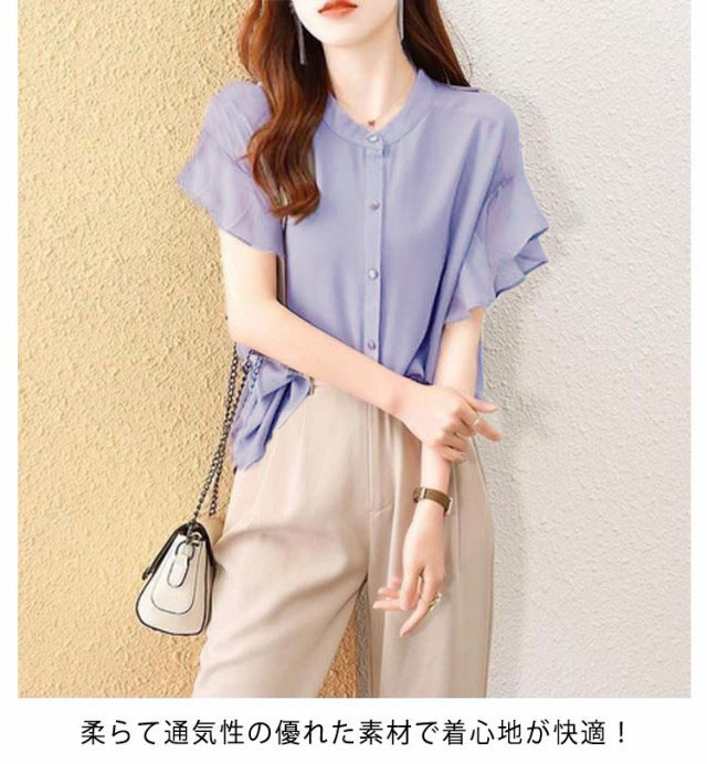 レディース ブラウス フレアスリーブ トップス 半袖ブラウス シャツ フレア袖 前開きシャツ 夏コーデ フリル 無地 フレンチスリーブ フォーマル 薄手 オフィス カジュアル 通勤 OL 結婚式 パーティー 二次会