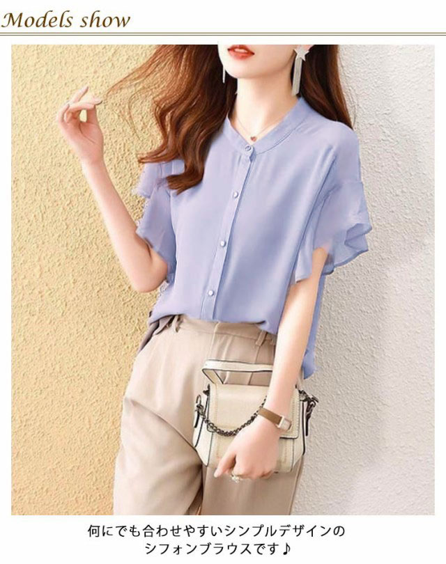 | ふんわり可憐な印象のフリル袖が大人可愛い。 何にでも合わせやすいシンプルデザインのシフォンブラウスです♪ 柔らて通気性の優れた素材で着心地が快適! ボトムはデニムやスカート、スラックス等とも合わせやすいです。 普段着としてだけでなく、オフィスコーデなどのフォーマルなシーンなどにも使える。 | |