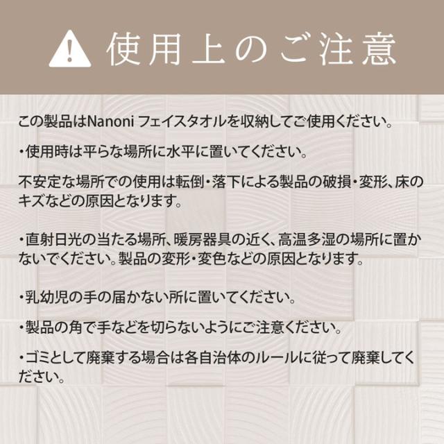 | 使用上のご注意 | ●この製品はいつでも清潔 Face towel を収納してご使用ください。 ●使用時は平らな場所に水平に置いてください。 不安定な場所での使用は転倒・落下による製品の破損・変形、床のキズなどの原因となります。 ●直射日光の当たる場所、暖房器具の近く、高温多湿の場所に置かないでください。 製品の変形・変色などの原因となります。 ●乳幼児の手の届かない所に置いてください。 ●製品の角で手などを切らないようにご注意ください。 ●ゴミとして廃棄する場合は各自治体のルールに従って廃棄してください。 |