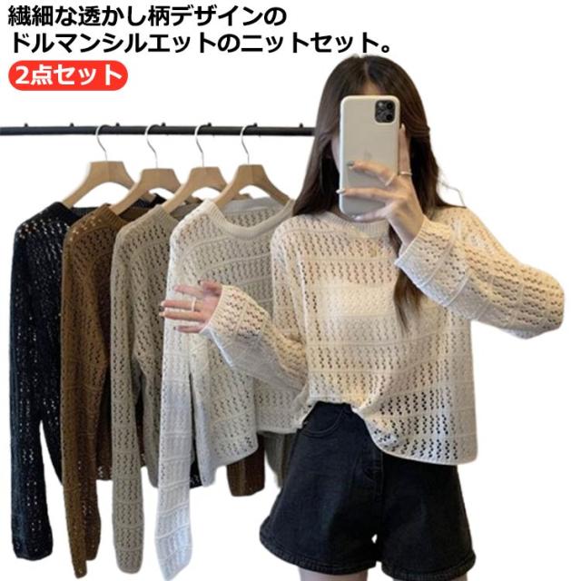 | 繊細な透かし柄デザインのドルマンシルエットのニットセット。 素肌に触れても心地良い、さらりと柔らかなニットです。 きれいめにもカジュアルにも着こなせる便利なアイテムです。 ゆったりとしたシルエットで気になる体型カバー効果あり! 透け過ぎず、ニットでも通気性が良いように柄の配置にこだわりました。 | |
