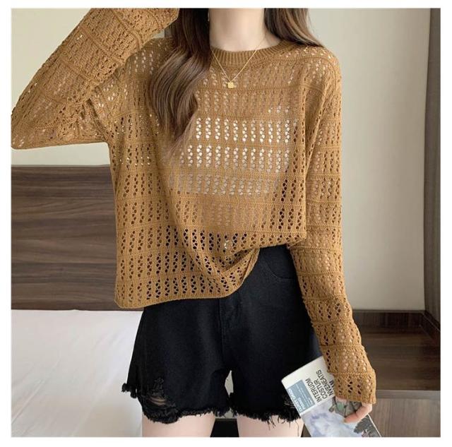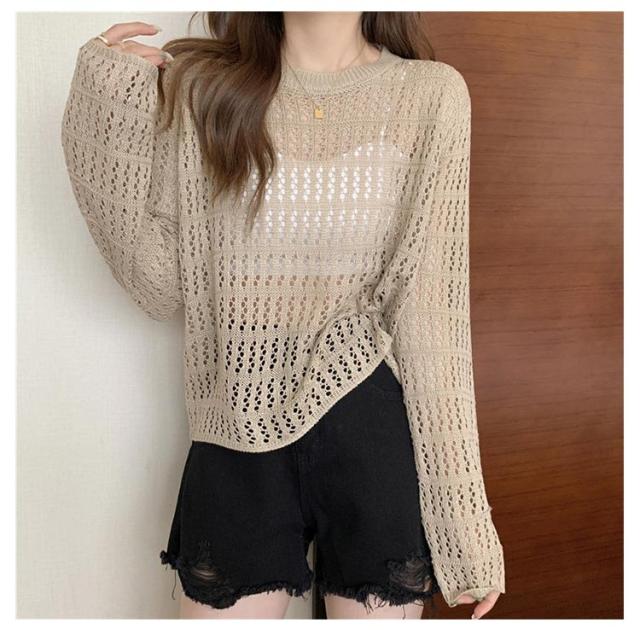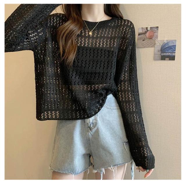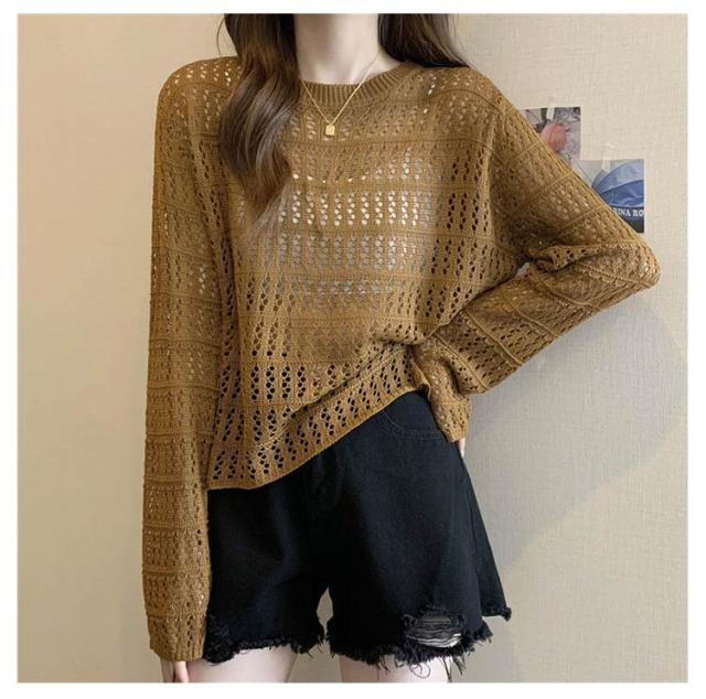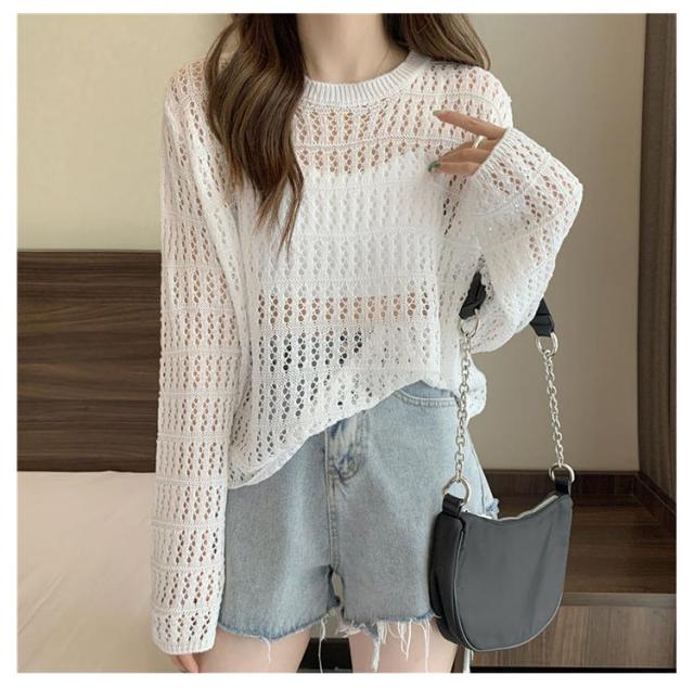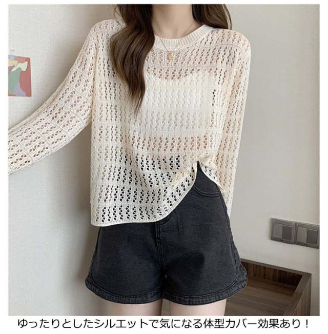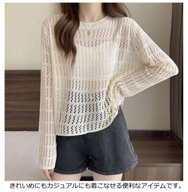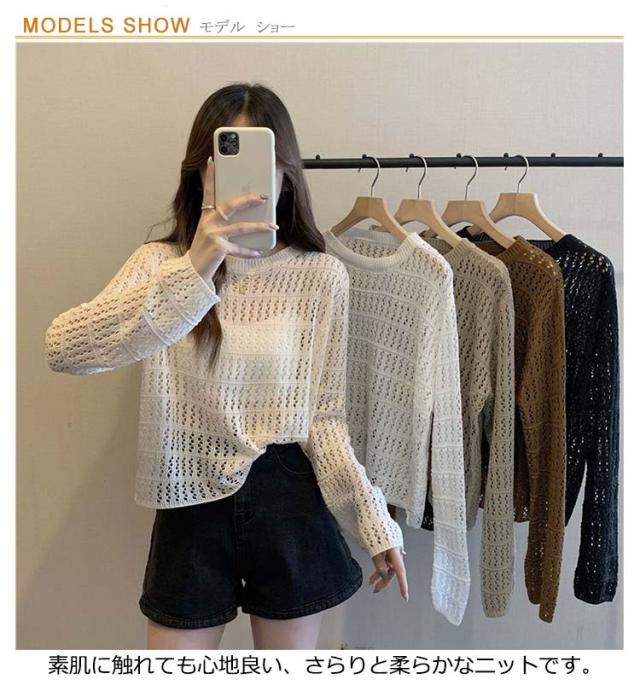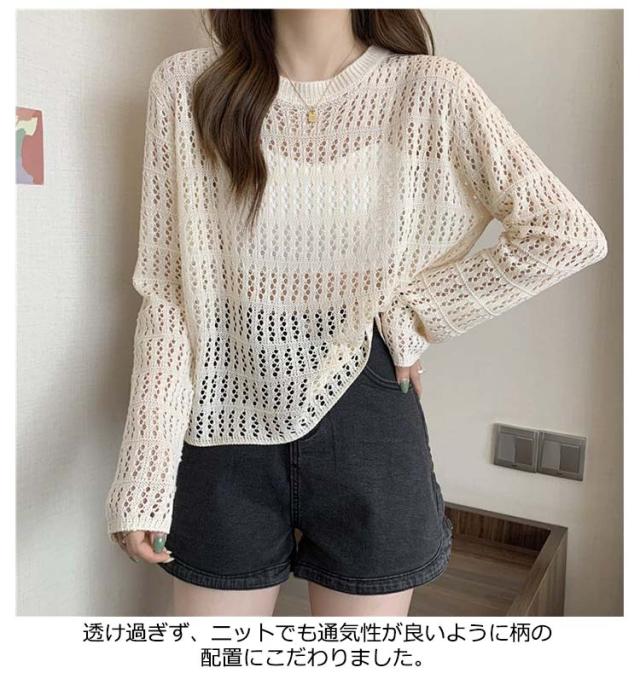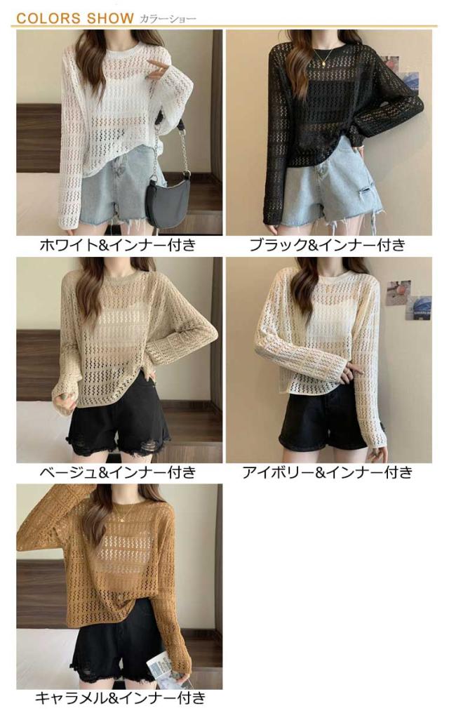 2点セット ニット インナー付き 透かし編み サマーニット 重ね着 レースアップ 長袖 トップス レディース 透け感 カットソー ゆったり 背中あき 春秋 かぎ編み 背中あき ルーズ プルオーバー レイヤード 韓国 トレンド S M L XL 2XL 送料無料