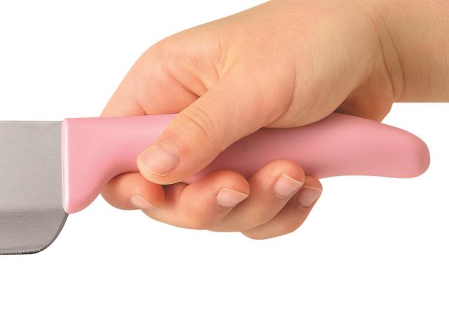 ハンドルは、握りやすいふっくらした丸みのある形状です。お子様の小さな手でも、しっかりとフィットします。ハンドル部にはすべり止め付きなので、指が刃が当たりにくく、より安全にお使いいただけます。