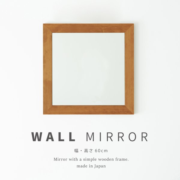 幅広枠正方形ウォールミラー(60)(ハニーブラウン/茶) 天然木 姿見鏡 ワイド 高級感 木製 飛散防止加工 壁掛け 北欧風 ヴィンテージ 韓国インテリア 玄関 トイレ 洗面 日本製 完成品 NK-32