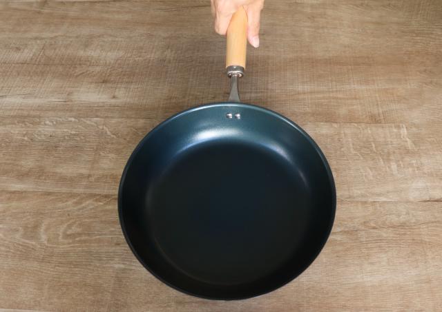 するりとした表面の本体と木目柄の取っ手は、使用するキッチンを選ばないシンプルなデザインです。鉄フライパンを感じさせない佇まいで、キッチン空間になじみます。