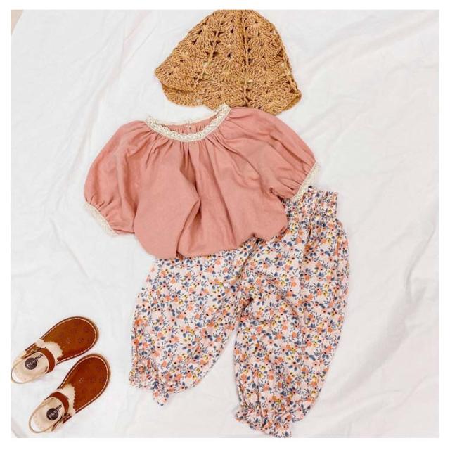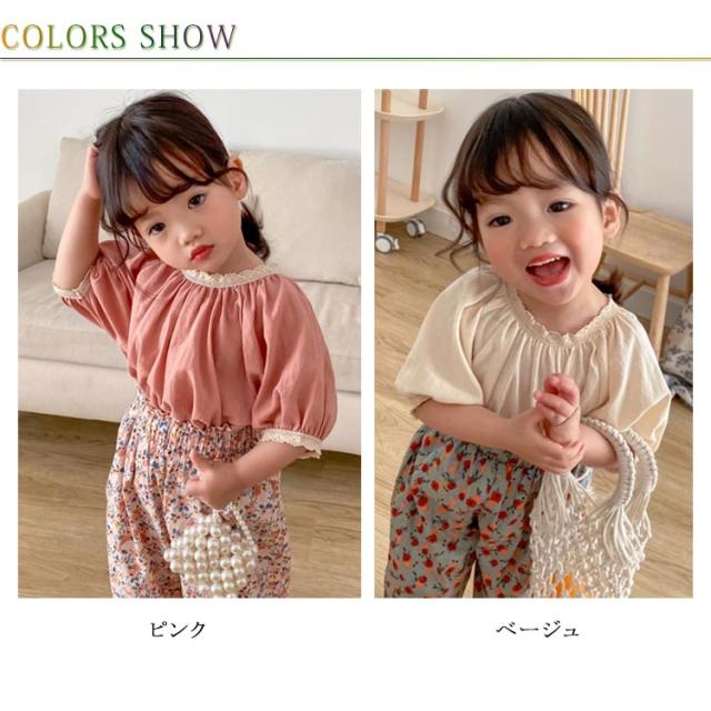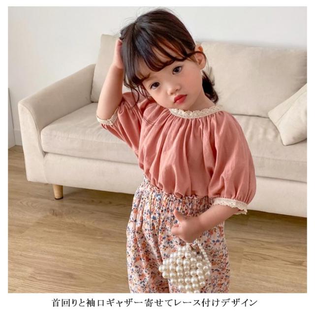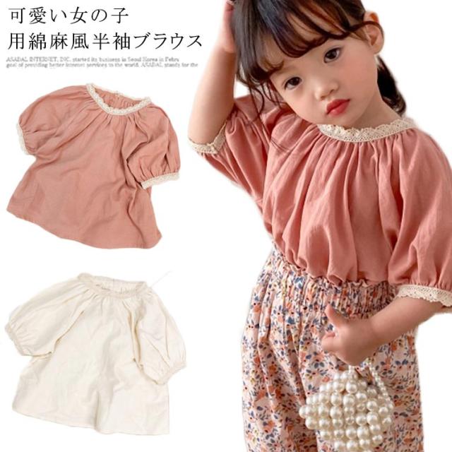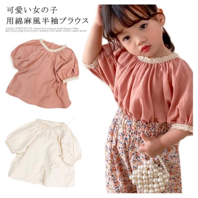 ブラウス ベビー Tシャツ 女の子 半袖tシャツ キッズ トップス 送料無料 ゆったり 半袖ブラウス 韓国子供服 ガールズ ラグランスリーブ キャザー 綿麻混 無地 コットン レース リネン 可愛い おしゃれ 夏