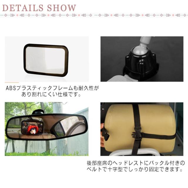 | 車の運転中に後部座席のチャイルドシートに乗っている赤ちゃんを視認できるミラーです。 それを車の後部座席に取り付けて、頭を振り返る必要がありません。 アクリル製のミラーは割れにくく、曲面鏡処理、死角が無く、広い視野持つ。 大面積なミラーは、顔だけでなく、赤ちゃんの全体画像を確認ことができます。 ABSプラスティックフレームも耐久性があり割れにくい仕様です。 ミラー部は360°回転可能、お子様が見えるようにミラーをお好みの角度に調整できます。 後部座席のヘッドレストにバックル付きのベルトで十字型でしっかり固定できます。 | |