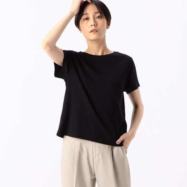 型はベーシックな丸首半袖で、着丈・身巾などは 適度なコンパクトさで一枚で着るのはもちろん、ジレや ニットカーディガンのインナーとしても使いやすい一品です。