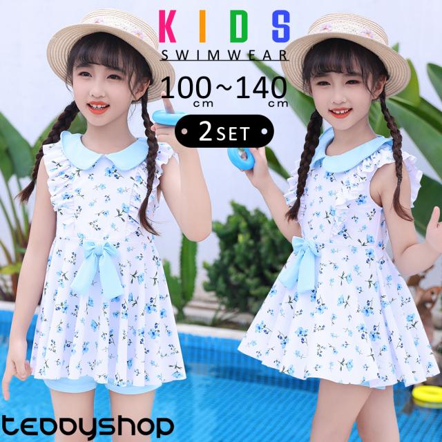 夏新作 キッズ 水着 女の子 セパレート ワンピース ノースリーブ ショートパンツ 2点セット 花柄 フリル 無地 フロントリボン 襟付き 丸襟 裏地付き ブラライナー ノンワイヤー パッド付き パッド入れ替え 一部サイズのみ 小学生 低学年