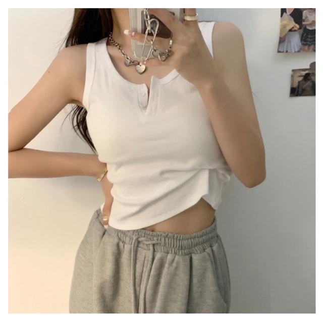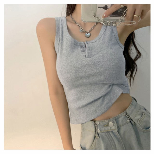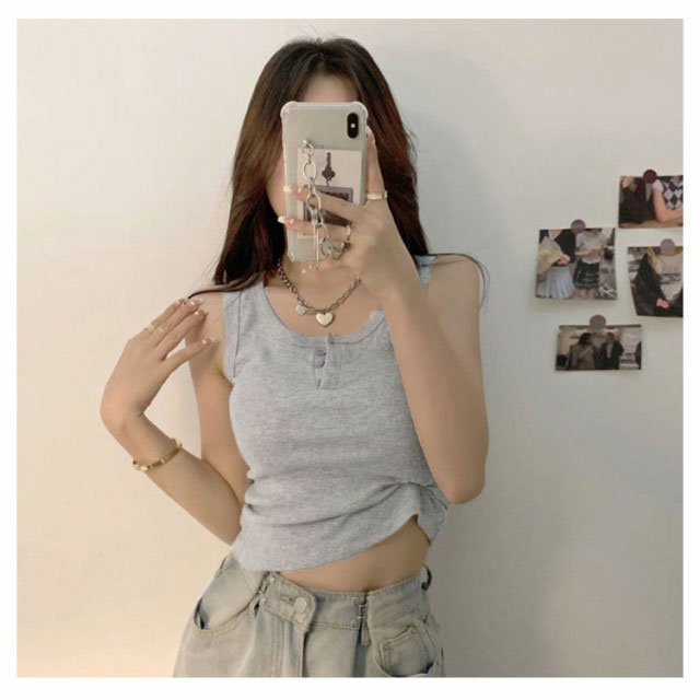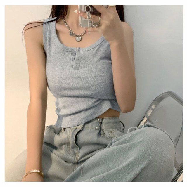 | センターのボタンがアクセントヘンリーネックのタンクトップ。 ヘンリーネックの大人カジュアルなタンクトップはこれからの季節に大活躍。 きちんと感のある大人のタンクトップは春夏に欠かせないアイテム。 伸縮性のあるリブ生地の縦長ラインが華奢見えを叶えてくれるのも◎。 もちろんインしてスッキリと着るのもおすすめです。フロントのボタンを開けてアレンジもできます。 | |