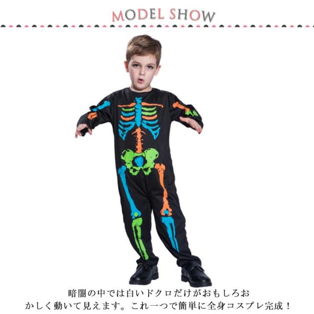 | ハロウィンの定番!おもしろ怖い骸骨コスプレ衣装です。 暗闇の中では白いドクロだけがおもしろおかしく動いて見えます。これ一つで簡単に全身コスプレ完成! からだにピッタリくっつかないので動きやすく、小さなお子様でも嫌がりません。 ハロウィン、クリスマス、パーティー、誕生日会、新生児の記念撮影、各種イベントなど使いどころがいっぱい! | |