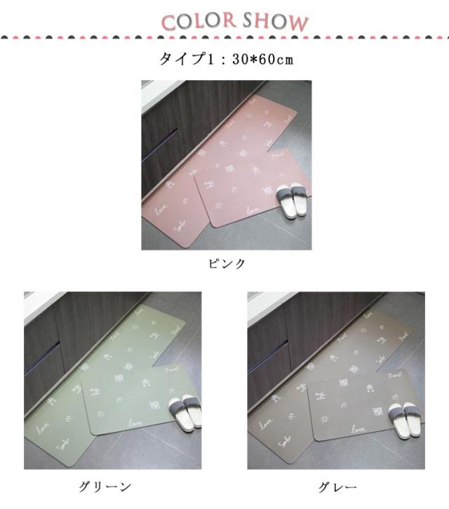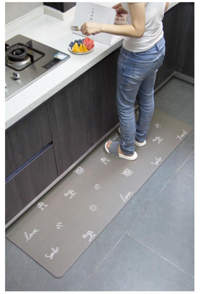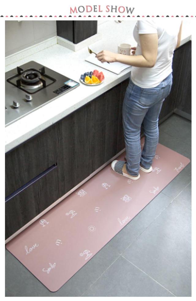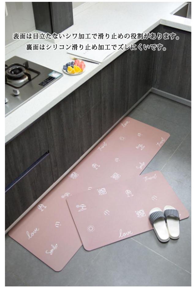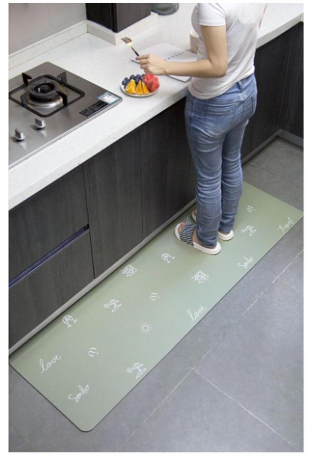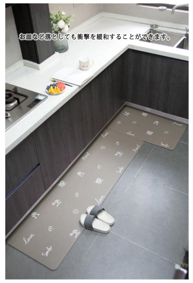 | 【疲労軽減 衝撃緩和】柔軟性のいい材質を使用しているし、6mm低反発ウレタン入りで適度なクッション性を備えています。踏み心地がよく、足裏にかかる体重を分散し、調理の時、足腰の疲労を和らげることができ、長時間の家事をしても快適です。お皿など落としても衝撃を緩和することができます。 【滑り止め加工】表面は目立たないシワ加工で滑り止めの役割があります。裏面はシリコン滑り止め加工でズレにくいです。 | |