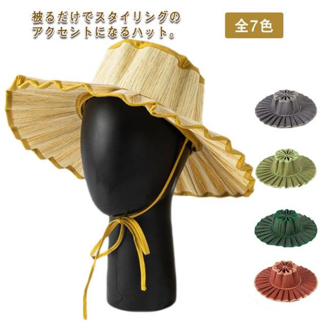 帽子 レディース 春ハット つば広ハット 折りたたみ プリーツ ペーパーハット 紐付き 撥水加工 折り畳み 麦わら帽子 ツバ広 日焼け対策 UV対策 紫外線対策 紫外線 日除け 夏 全7色