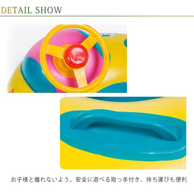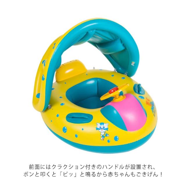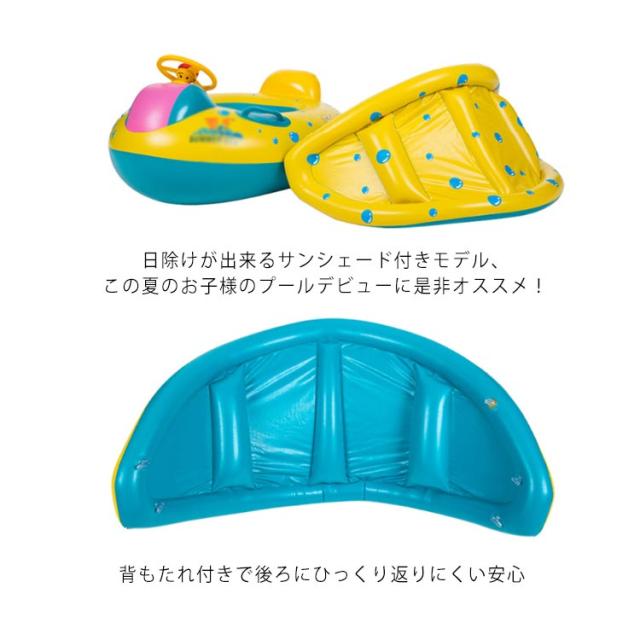 | 海やプールで水遊びを楽しみながら強烈な日差しからお子様をしっかり守る外し可能なサンシェード付きうきわ。 日差しから頭部を守る屋根付きカワイイボートタイプ浮き輪で夏の楽しい思い出を作ろう。 足入れタイプなので、小さなベビーも落下の心配がなく安定感抜群。 前面にはクラクション付きのハンドルが設置され、ポンと叩くと「ピッ」と鳴るから赤ちゃんもごきげん! 日除けが出来るサンシェード付きモデル、この夏のお子様のプールデビューに是非オススメ! | |