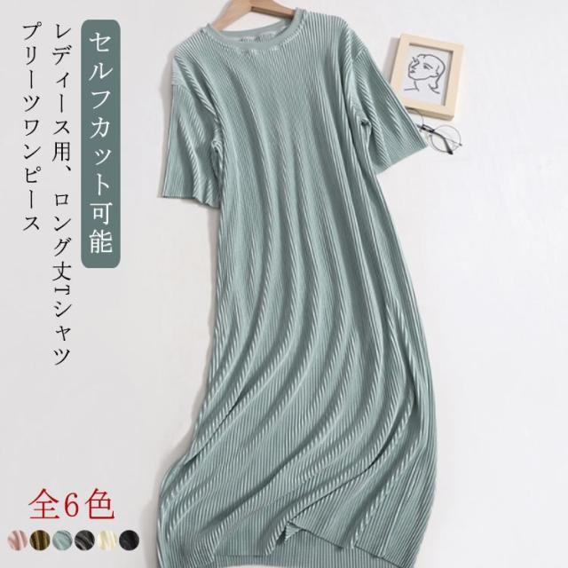 全6色 ワンピース 夏 レディース プリーツワンピ プリーツワンピース 半袖 ゆったり ルームウェア カジュアル プリーツ プリーツワンピース セルフカット 低身長 高身長 楽ちん 体型カバー ピンク カーキブラウン ブルー グレー ベージュ ブラック