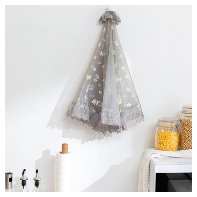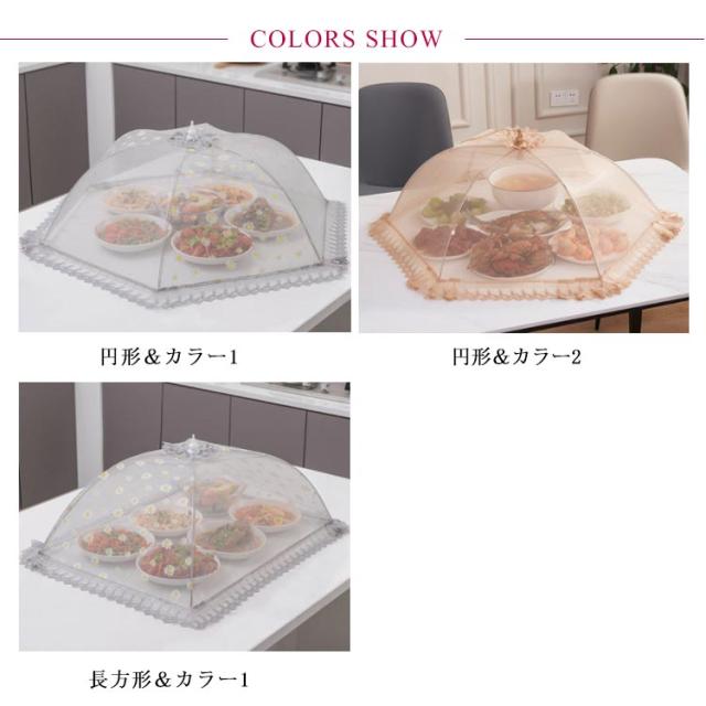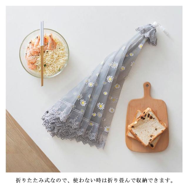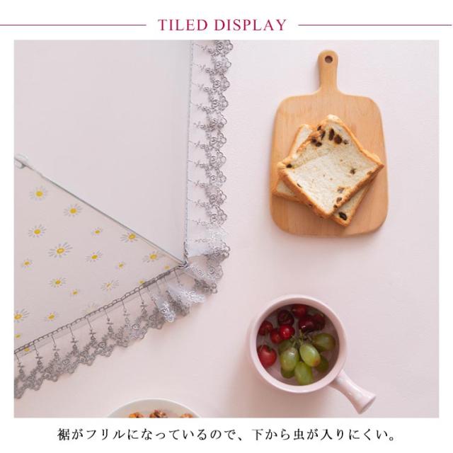 | 食事をほこりや虫から守ります! ひもを引くだけでOK! 洗える食卓カバーなので、汚れても安心。 | |