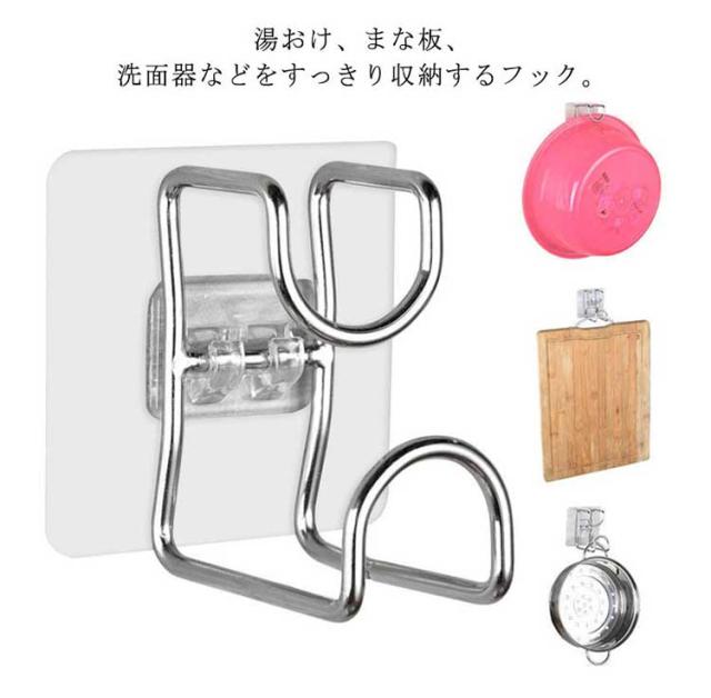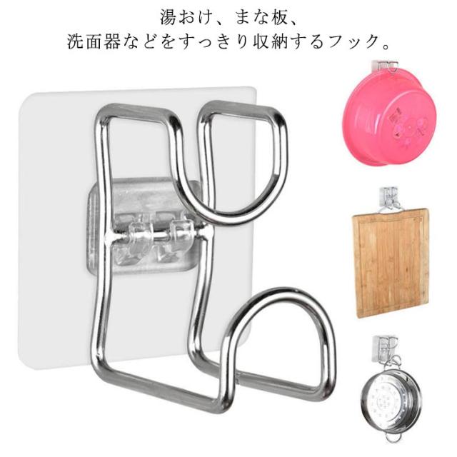| 湯おけ、まな板、洗面器などをすっきり収納するフック。 強力粘着力と丈夫なステンレス製で、サビに強く、9KG程度の重さに耐える壁掛けフック。 シンプルでコンパクトな作りで無駄のないすっきりしたフォルムが素敵です。 キッチンや浴室の壁面を利用して場所を取らず、すっきりした収納できます。 | |