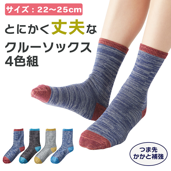 レディース 2005440 とにかく丈夫な クルーソックス 4色組 22-25cm クルー丈 つま先補強 かかと補強 摩耗耐久 丈夫 擦り切れにくい 婦人 三笠 MIKASA