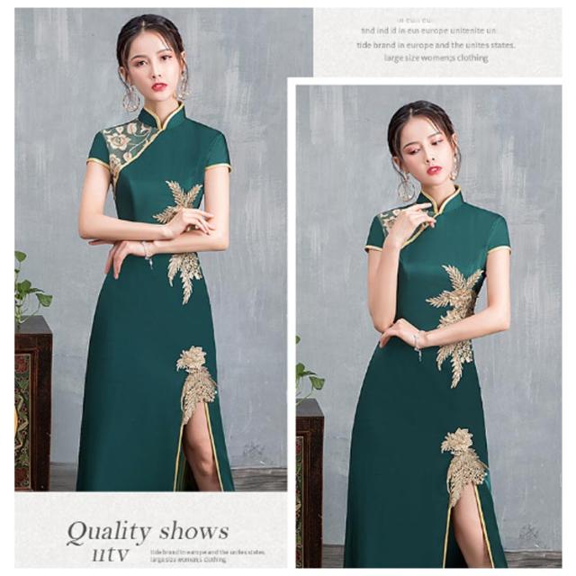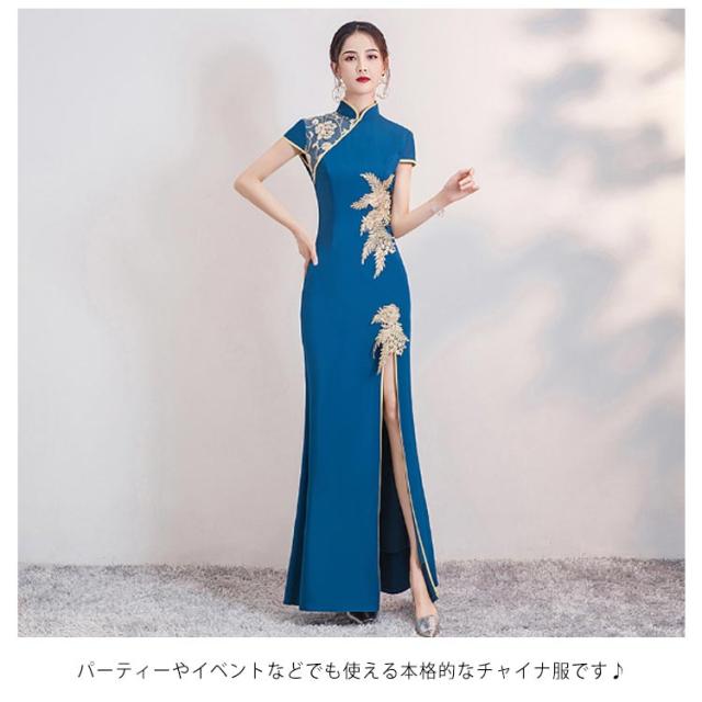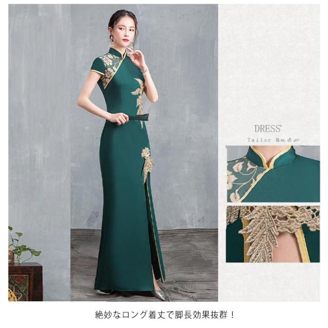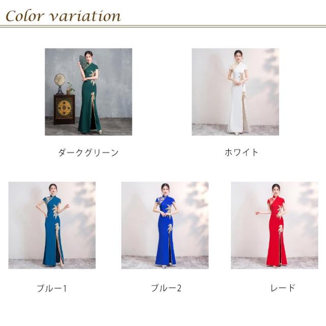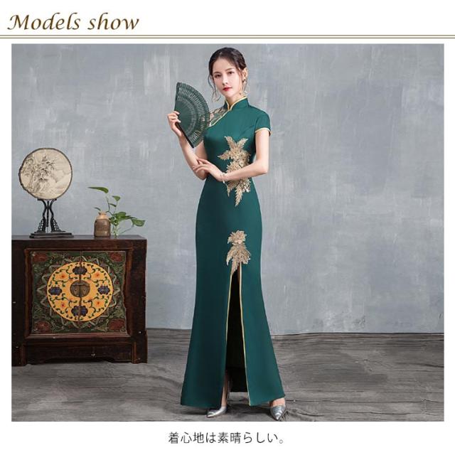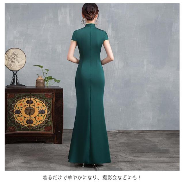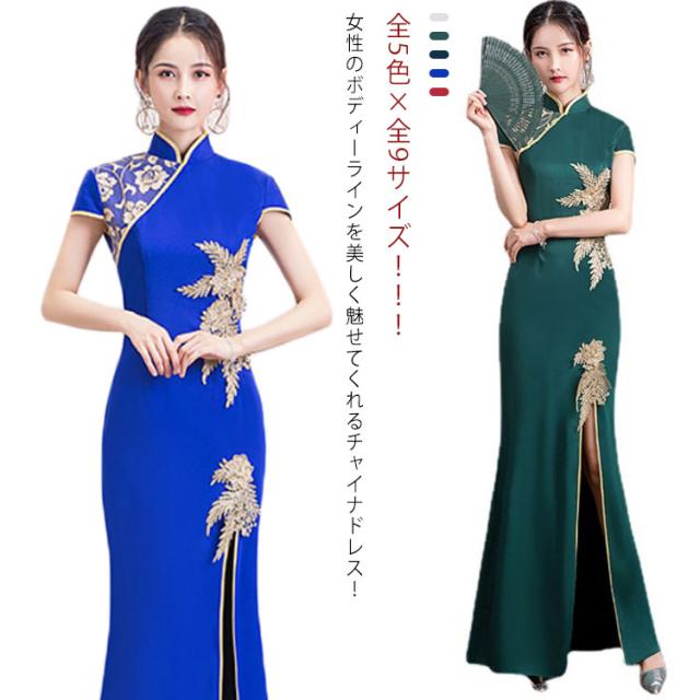 チャイナドレス ロング丈ドレス サリムラインドレス 半袖 中華服 ロングワンピース パーティードレス マーメイドドレス 人魚裾 スリット 古典ダンス衣装 合唱衣装 音楽会 イベント 文化祭 撮影衣装 華やか おしゃれ セクシー エレガント 結婚式 5色 XS-5XL