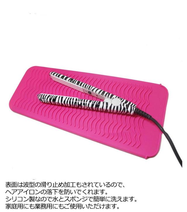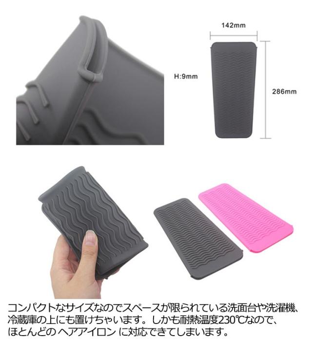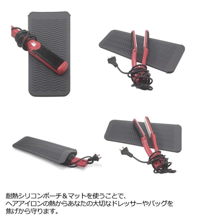 | アツアツのヘアアイロンがさっと収納や片付けが出来る耐熱ポーチ&マットです。 耐熱シリコン製なので、使用中のヘアアイロンの置き場としてもお使いいただけます。 耐熱シリコンポーチ & マット を使うことで、ヘアアイロン の熱からあなたの大切なドレッサーやバッグを焦げから守ります。 表面は波型の滑り止め加工もされているので、ヘアアイロンの落下を防いでくれます。シリコン製なので水とスポンジで簡単に洗えます。家庭用にも業務用にもご使用いただけます。 コンパクトなサイズなのでスペースが限られている洗面台や洗濯機、冷蔵庫の上にも置けちゃいます。しかも耐熱温度230℃なので、ほとんどの ヘアアイロン に対応できてしまいます。 洗面所のちょっとした場所に置きたい!という時でも、安心して使用出来ます。 | |