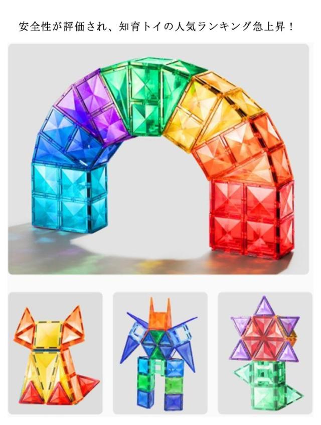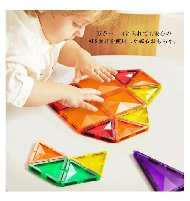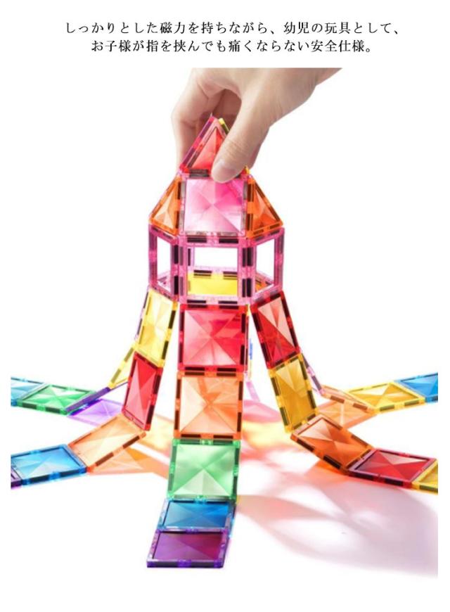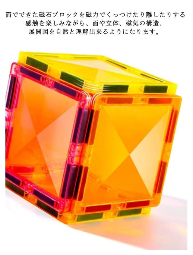 | 万が一、口に入れても安心のABS素材を使用した磁石おもちゃ。ひらめきの力を育む、組み立て知育玩具です。しっかりとした磁力を持ちながら、幼児の玩具として、お子様が指を挟んでも痛くならない安全仕様。 安全性が評価され、知育トイの人気ランキング急上昇!保育園、幼稚園、幼児教室、キッズ スペースへの納入も多数あり、お誕生日、入園祝い、入学祝い、クリスマス プレゼント、ギフト、贈り物に選ばれている 知育おもちゃ です! 面でできた磁石ブロックを磁力でくっつけたり離したりする感触を楽しみながら、面や立体、磁気の構造、展開図を自然と理解出来るようになります。プラスティックが透明で内部構造が理解しやすくなっている知的 玩具です。 パーツをどのように組み立てたら作りたい図形が組み上がるかな?頭脳を使って立体的な図形を組み立てるので、学習玩具としても役立ちます。 | |