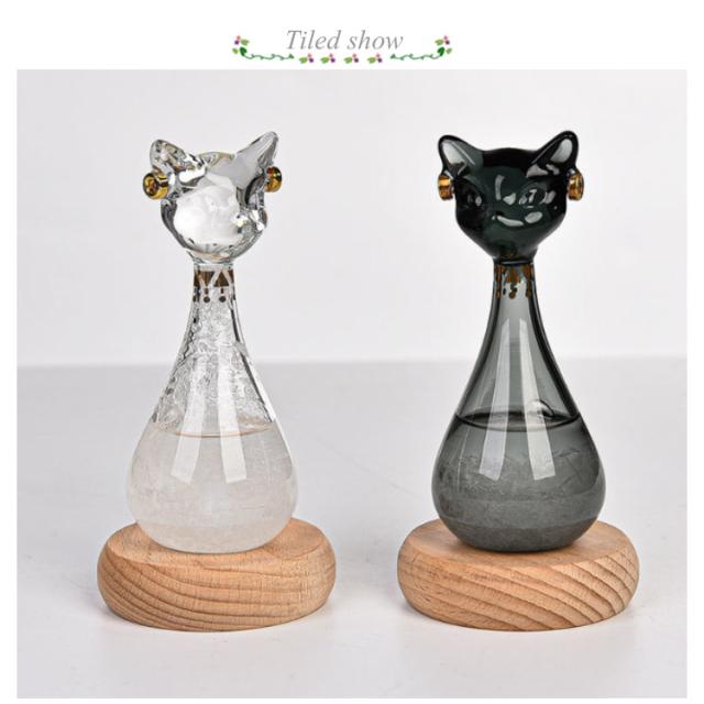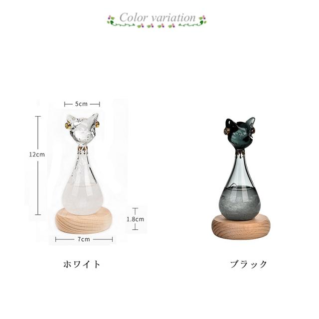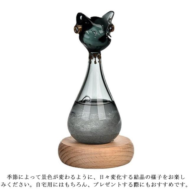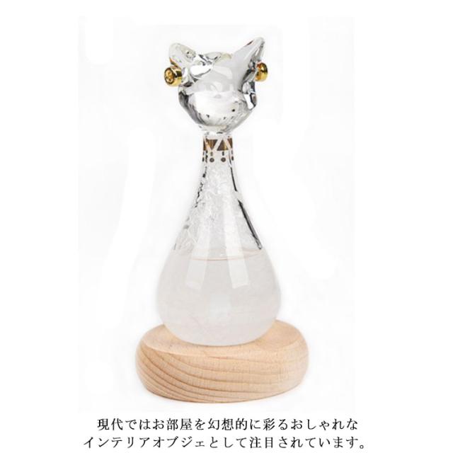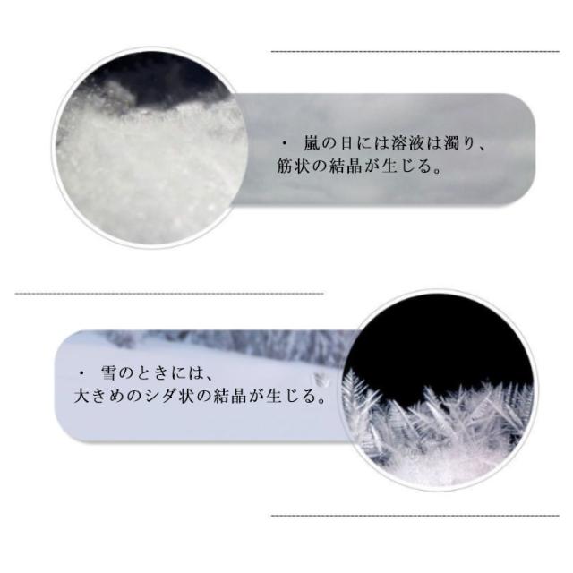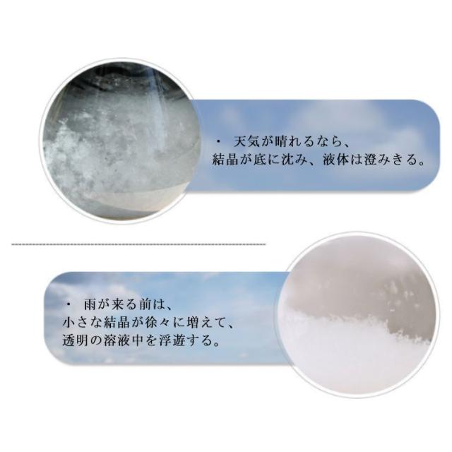 | 透明なガラス容器に、エタノール・塩化アンモニウム・酸化カリウムなどの化学物質を溶かした混合液が詰められており、天気によってさまざまな形の結晶があらわれる。 ・ 天気が晴れるなら、結晶が底に沈み、液体は澄みきる。 ・ 雨が来る前は、小さな結晶が徐々に増えて、透明の溶液中を浮遊する。 ・ 雪のときには、大きめのシダ状の結晶が生じる。 ・ 嵐の日には溶液は濁り、筋状の結晶が生じる。 現代ではお部屋を幻想的に彩るおしゃれなインテリアオブジェとして注目されています。季節によって景色が変わるように、日々変化する結晶の様子をお楽しみください。自宅用にはもちろん、プレゼントする際にもおすすめです。 | |