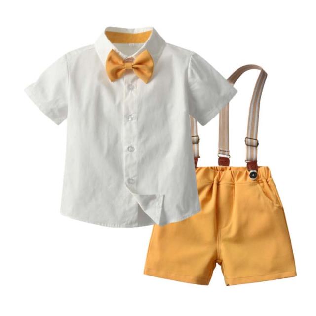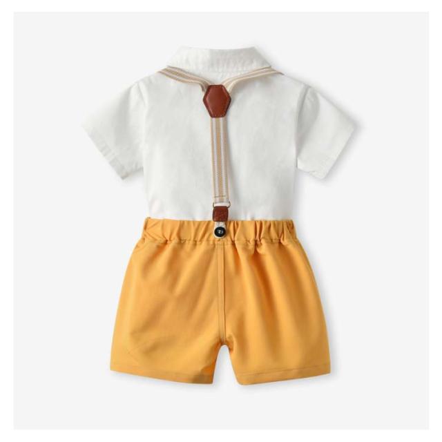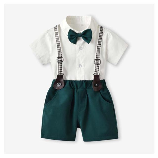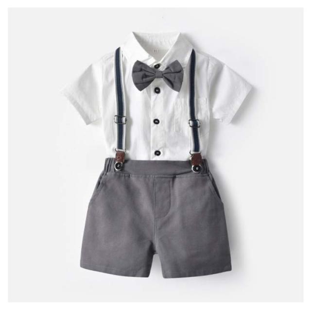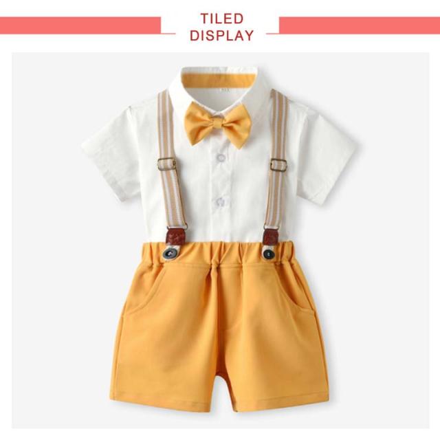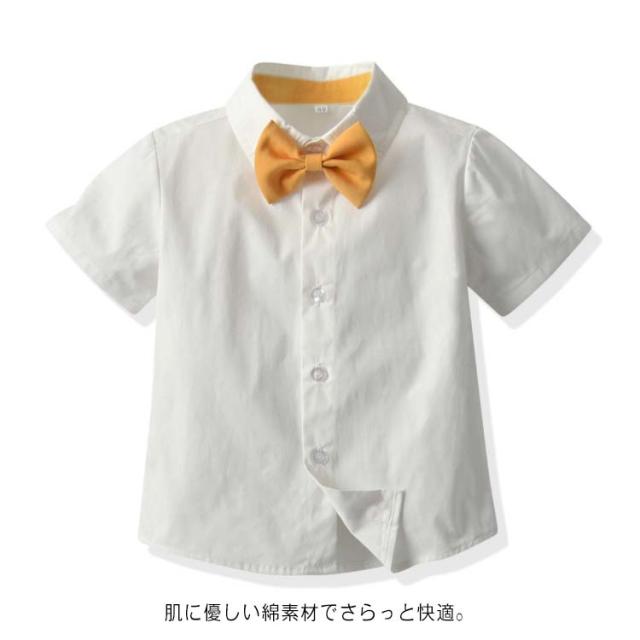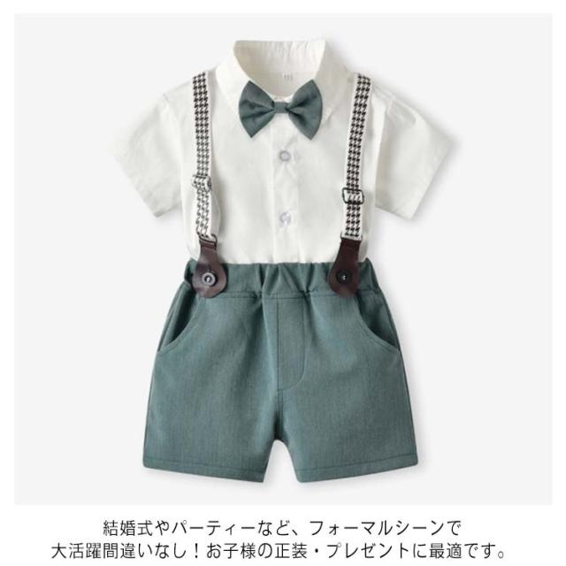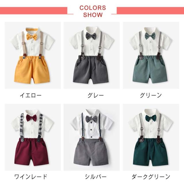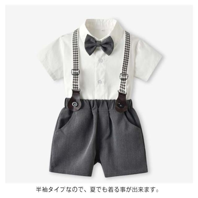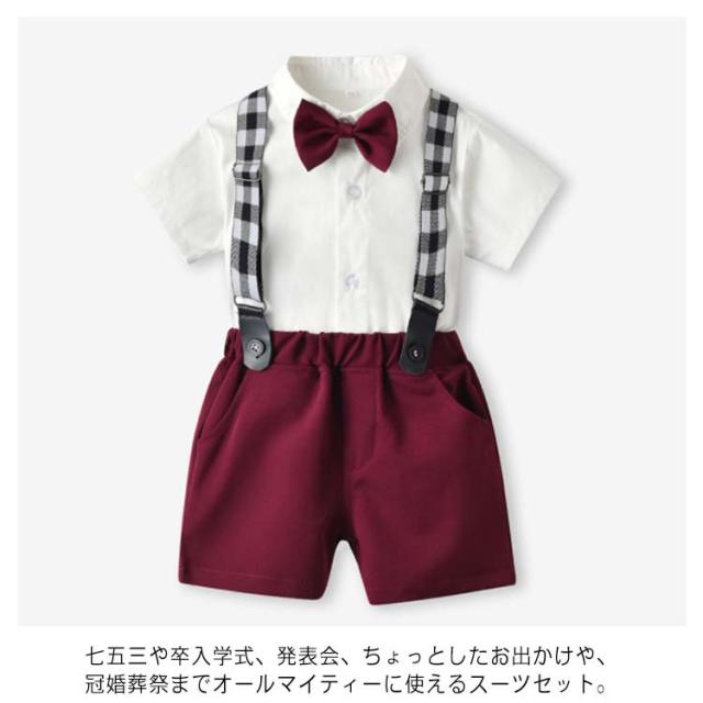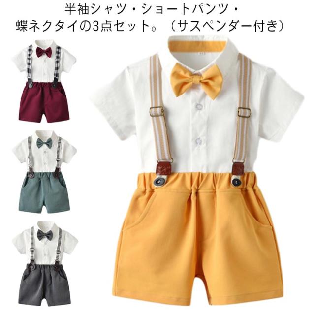 フォーマル スーツ 男の子 セットアップ 半袖 夏 キッズスーツ 子供服 3点セット 半袖 シャツ ショートパンツ 蝶ネクタイ 子供スーツセット サスペンダー付き タキシード 誕生日 1歳 入学式 結婚式 入園式 卒業式 お宮参り 七五三 おしゃれ 70-130cm 送料無料