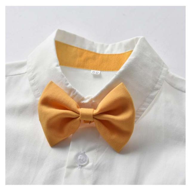 | 半袖シャツ・ショートパンツ・蝶ネクタイの3点セット。(サスペンダー付き) 半袖タイプなので、夏でも着る事が出来ます。 肌に優しい綿素材でさらっと快適。 ウエストゴム仕様で履き心地ラクラク。 結婚式やパーティーなど、フォーマルシーンで大活躍間違いなし!お子様の正装・プレゼントに最適です。 七五三や卒入学式、発表会、ちょっとしたお出かけや、冠婚葬祭までオールマイティーに使えるスーツセット。 | |