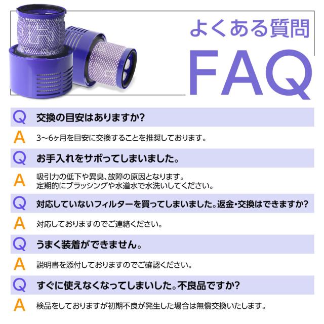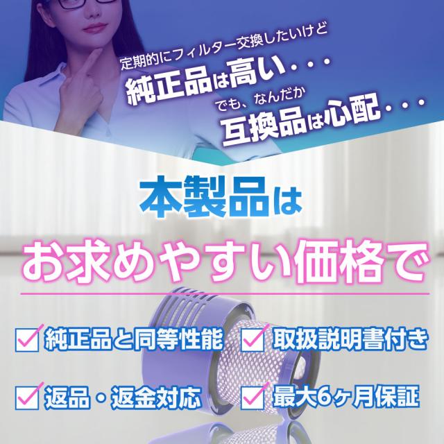 | 商品特徴 | 【対応機種】 969082-01互換(SV12) ・Cyclone V10 Fluffy ・Cyclone V10 Fluffy+ ・Cyclone V10 Motorhead ・Cyclone V10 Absolute Extra ・Cyclone V10 Absolute Pro ・Cyclone V10 Animal+ ・2021年ジャパネットモデル Cyclone V10 Motorhead (SV12 MH YE) ・2021年ジャパネットモデル Cyclone V10 Motorhead (SV12 MH PU) ・2022年モデル Cyclone V10 Fluffy (SV12 FF LF)、及びCyclone V10 Fluffy (SV12 FF LF BK) 【純正品と遜色ない性能】 微細な粒子や不快なニオイを効果的に除去し、清潔で快適な室内環境を提供します。 厳格な品質管理により製造され、確かな性能と信頼性をお約束します。 【99.97%の微粒子をキャッチ】 高性能HEPAフィルターが0.3ミクロンの超微細粒子を99.97%以上をキャッチ。 クリーンで健康的な生活空間を提供します。 日常の家庭内汚染物質を効果的に除去し、空気を清潔に保ちます。 【アレルギー対策に最適】 アレルゲンや微細なダストに対応したHEPAフィルターは、アレルギー体質の方にも安心です。 花粉、ペットのフケ、ダニの排泄物など、アレルギーの原因となる粒子を確実に捕らえ、室内環境を清潔に保ちます。 【水洗い可能で清潔】 繰り返し水洗いが可能なため、経済的かつ環境に優しいです。 定期的な水洗いによりフィルターの性能を維持し、長期間にわたり清潔な空気で生活ができます。 簡単な手入れで常に最高の性能を発揮します。 【水洗い時の注意点】 十分に乾いたことを確認してから掃除機に取り付けしてください。 カビや臭い、掃除機故障の原因となります。 【交換目安】 3〜6ヶ月での交換を推奨します。 臭いがとれない、音が大きい、掃除機の性能が落ちた気がするなどが確認できたら交換サインです。 【パッケージ内容】 SV12(V10)対応フィルター、専用ブラシ×1。 【アフターサービス】 厳格な品質検査を複数回実施し、品質には万全を期しています。 万が一の不良品やモデル間違いによる返品・交換も迅速に対応いたしますので、ご連絡ください。 |