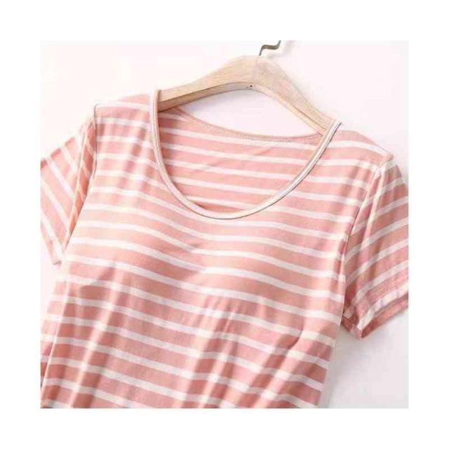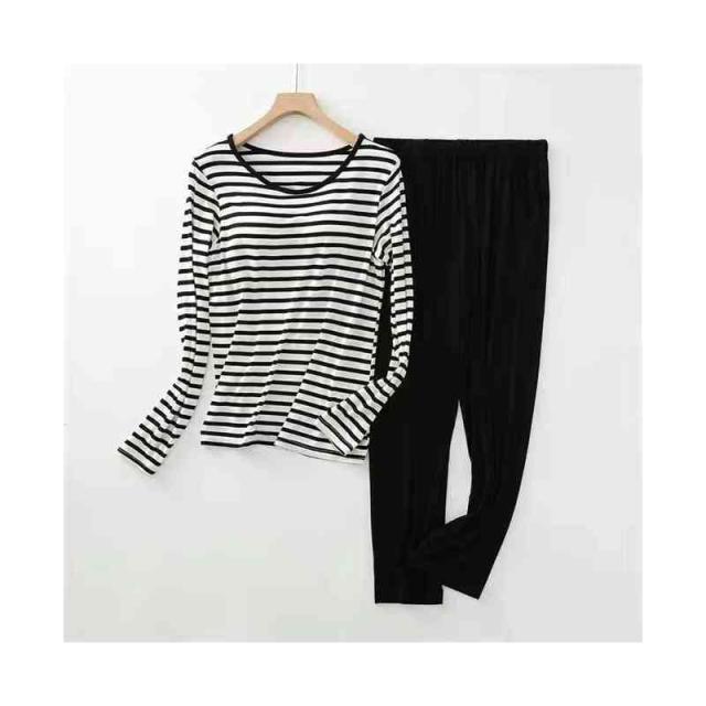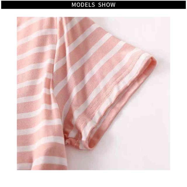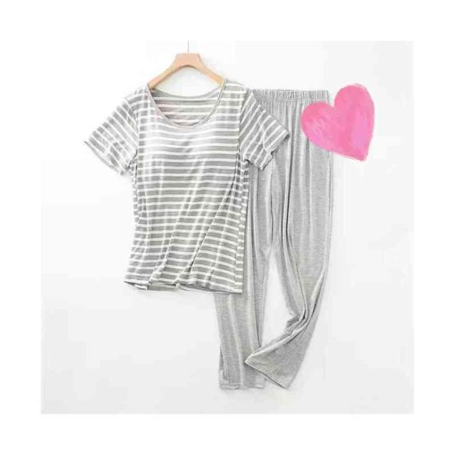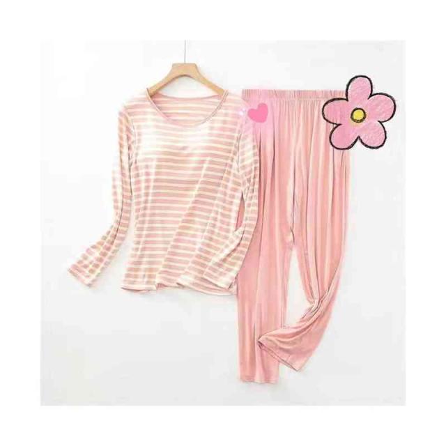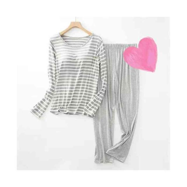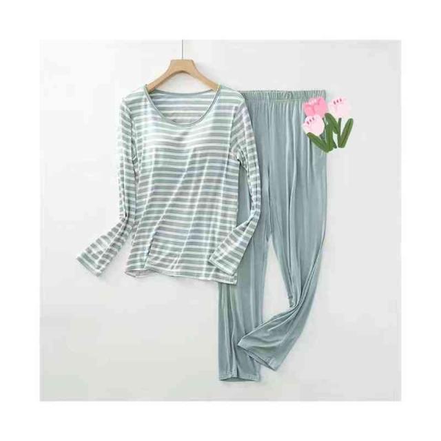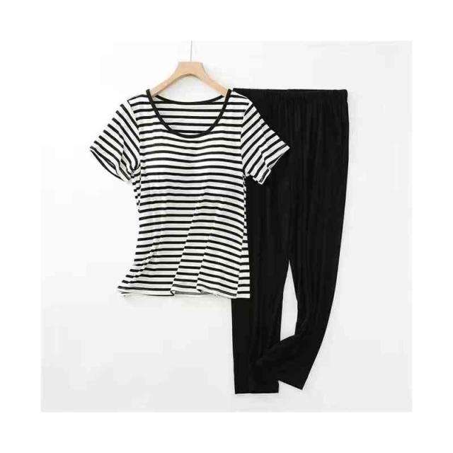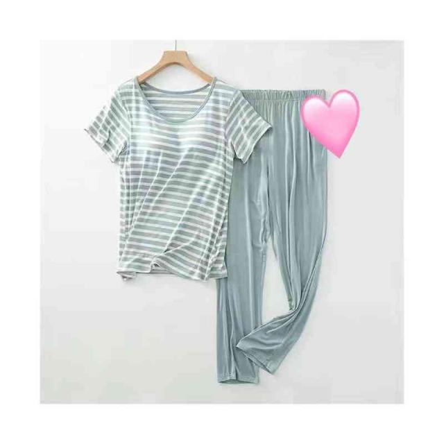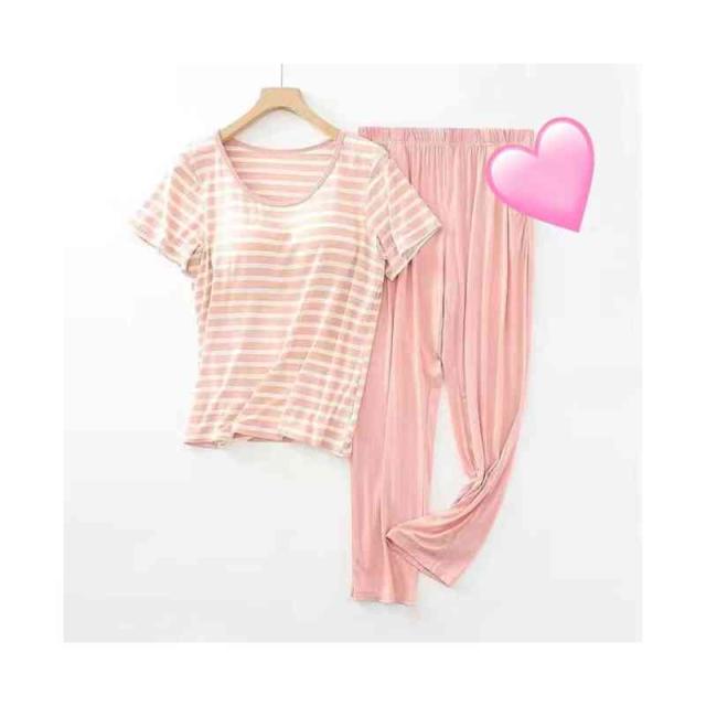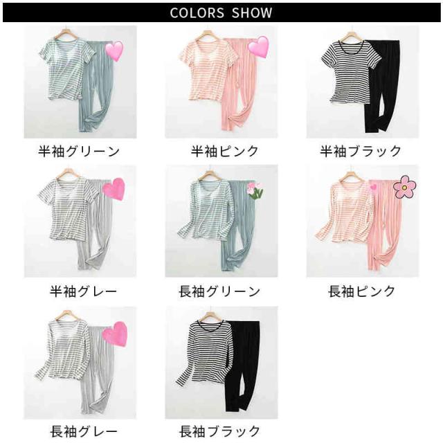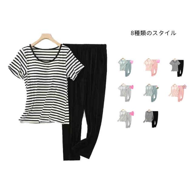 パジャマ レディース 春夏秋 半袖トップス ロングパンツ ボーダー柄 ルームパジャマ 二点セット カップ付きボーダー柄ブラウス ルームウエア 寝巻き 部屋着 ロングボトムス セットアップ シンプル カジュアル 送料無料 普段着