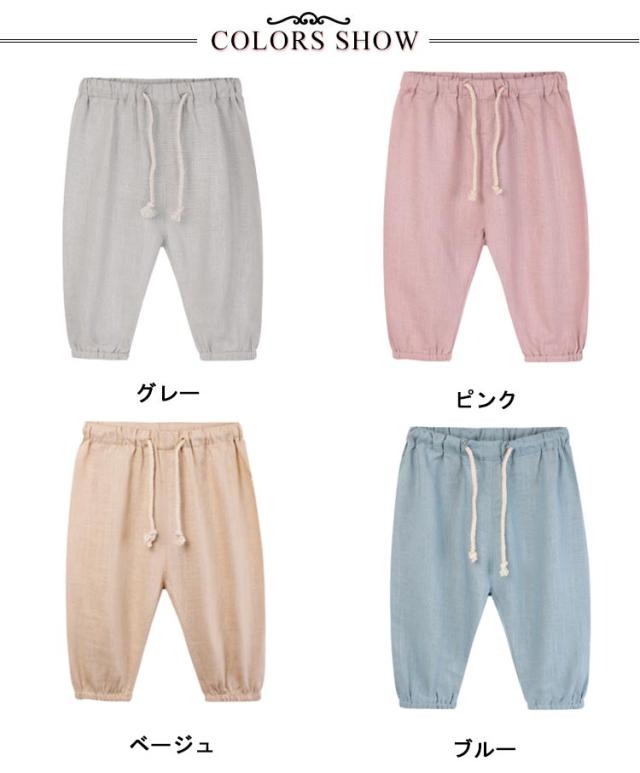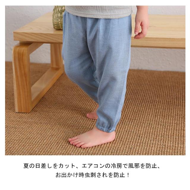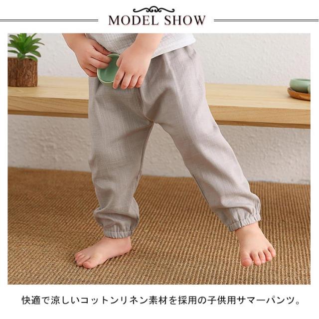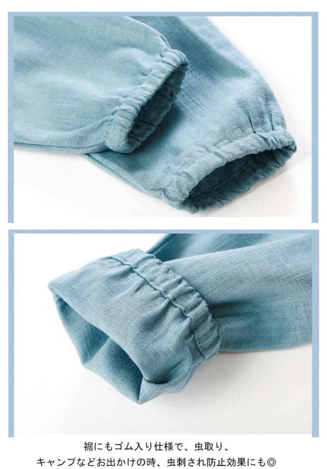 | 真夏でも涼しく履ける通気性の良い涼しい綿麻ロングパンツ。 リネンのサラッとした風合いとレーヨンのしなやかさを合わせ持つリネンレーヨン生地です。 ウエストはゴム仕様で締め付け感が少なく、着替えもラクラク。 足裾にはゴム入りなので、夏の防蚊対策にも役立てます。 80cm〜130cmまでのサイズ展開で姉妹・兄弟でお揃いにして着ても可愛いアイテム。 普段着だけでなく部屋着としても◎ 色違いの着回しはオススメ◎お好きなカラーぜひ♪ | |