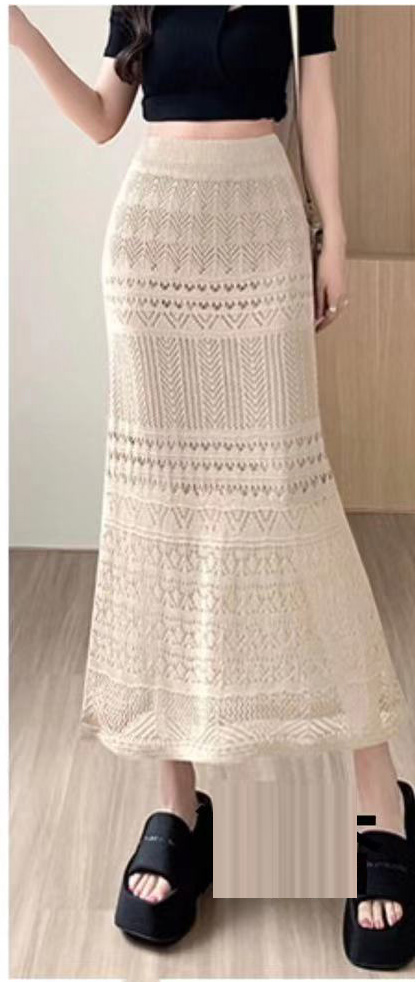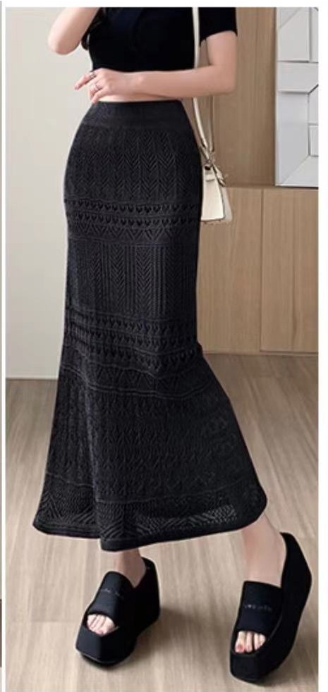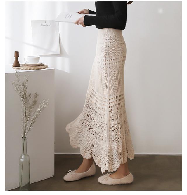クロシェ かぎ編み ロングスカート マーメイドスカート ロング丈 膝下スカート 春 夏 ママ オフィスカジュアル レース 大きいサイズ ウエストゴム 体型カバー クロシェニット ストレッチ