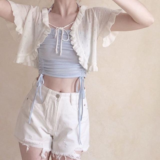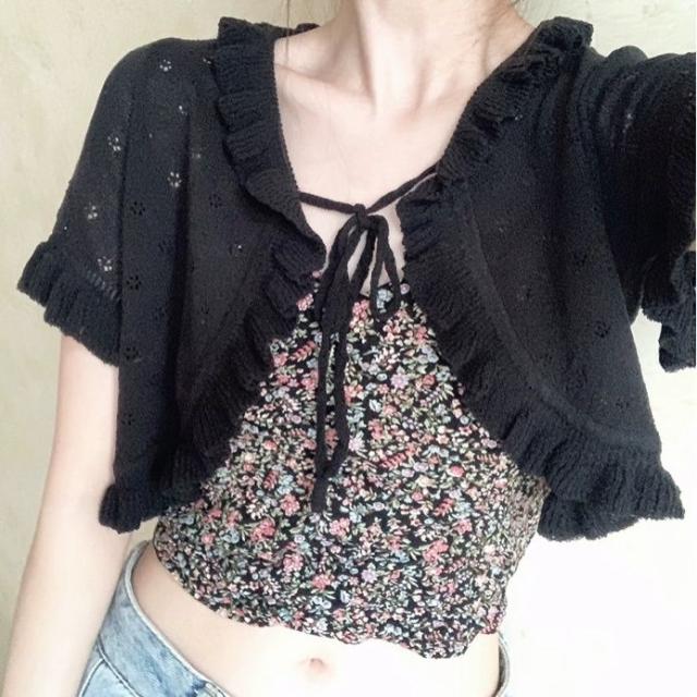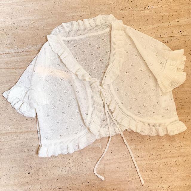 半袖 カーディガン サマー カーディガン 夏 半袖カーディガン レディース シアーカーディガン サマーニット 袖フリル ショート丈 透かし編み 薄手