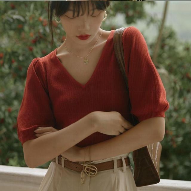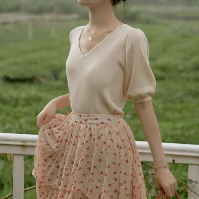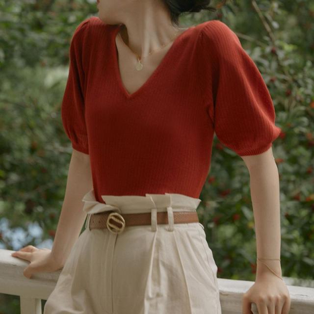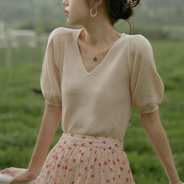 サマーニット トップス tシャツ Tシャツ vネック 半袖 カットソー 春 夏 レディース ゆったり おしゃれ パフスリーブ サマーカーディガン