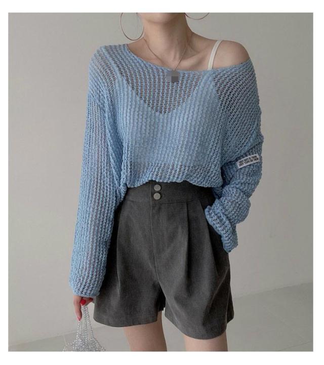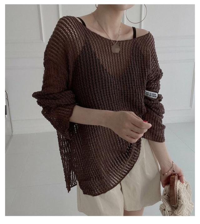 シースルー ニット 透かし編み サマーニット ニットソー トップス プルオーバー メッシュニット クルーネック 日焼け対策 長袖 シンプル 無地 春夏 大きサイズ 5色