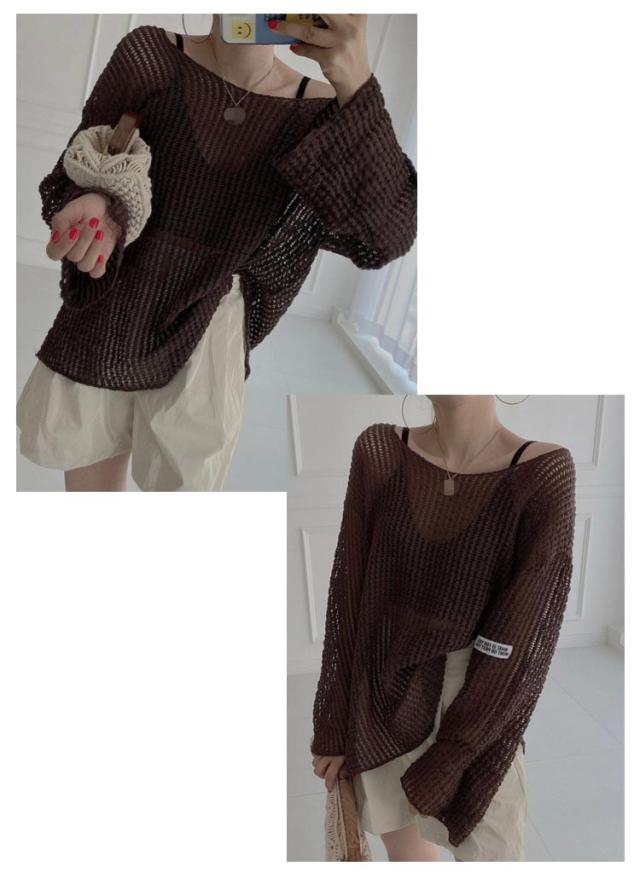 | 全5色!春夏にぴったりのシースルー編みニットトップス。 広がったクルーネックデザインだから窮屈感なく、小物などにも映えやすい。 透け感編みがほんのり肌見せできて、大人女性らしさを演出してくれます。 タンクトップやキャミワンピースなどと合わせることがおススメです。 | |