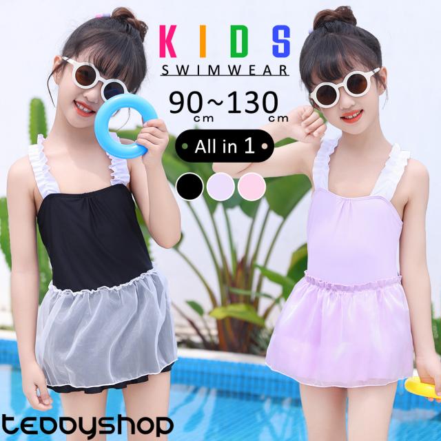 夏新作 キッズ 水着 女の子 ワンピース オールインワン フリル キャミワンピ フレア チュール スカート 無地 ノースリーブ 肩フリル バッククロス シンプル ショーツ一体型 ネームタグ 水遊び プール 海 日焼け対策 幼稚園 保育園 小学生 バイカラー 黒 白