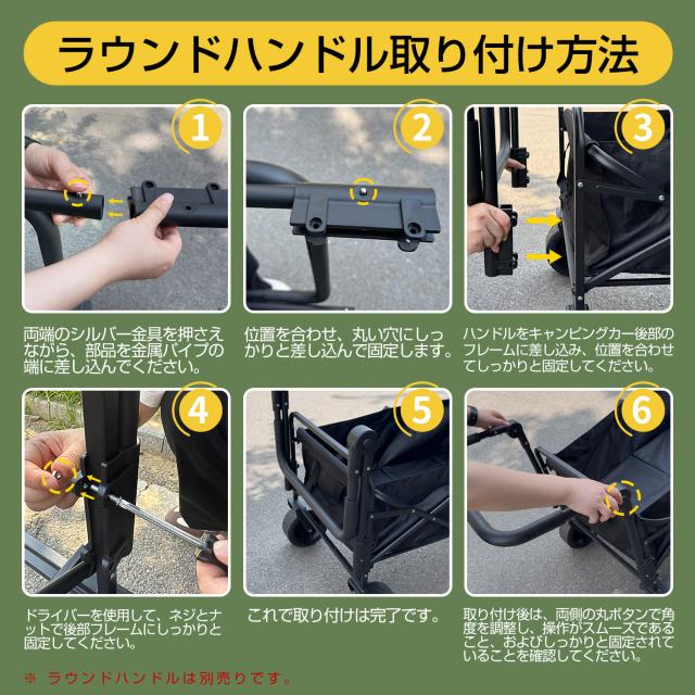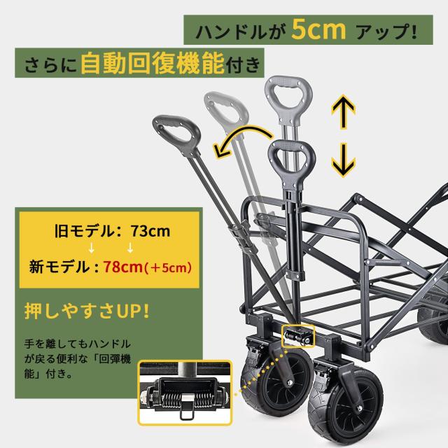 キャリーワゴンを便利に操れるように持ちやすいハンドル形状に設計しています。ハンドルの高さは72〜98CM調整可能、身長やシーンにより自由に調整できます。また、本体から引っ張って角度調整もできます。さらに便利なアウトドア活動に役にたちます。