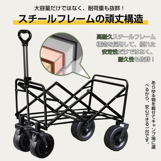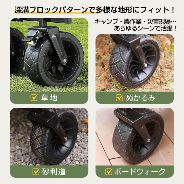 「ワゴン業界で最大サイズのタイヤ」とこでも、どんな場所までも平然と行ける、ワゴン業界で最大サイズのタイヤ!タイヤの直径は17センチ、幅の太さは9センチ!また、タイヤの転がりもスムーズになります!360度回転可能で、操作も便利!従来のタイヤより大きく、より頑丈、より使いやすいタイヤ!山でも砂利道でも湿った砂浜でも楽々移動可能、アウトドアで最適です。