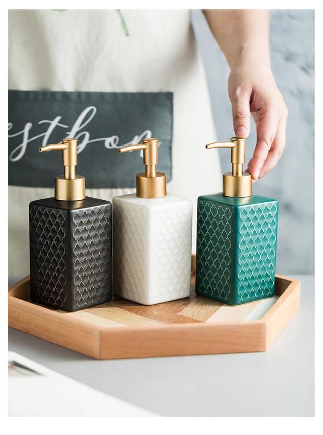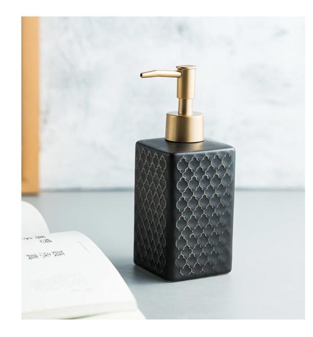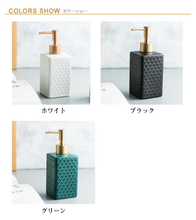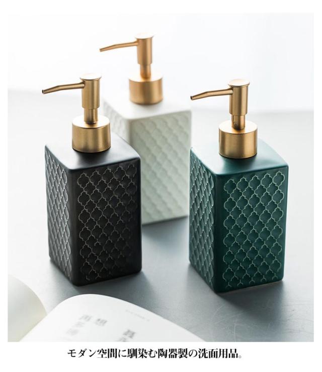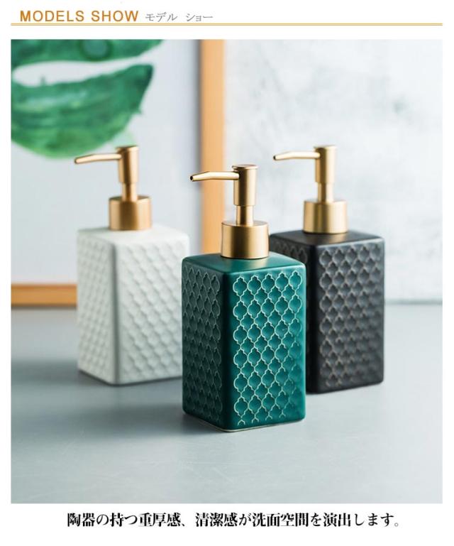 | エレガントなバスルームを演出する、ダイヤ柄の液体シャンプー用ディスペンサーボトル。 陶器の持つ重厚感、清潔感が洗面空間を演出します。 バスル一ムや洗面台などの狭い空間でも無駄なく使える角型ボトルなので、落ち着いた感じが抜け出し、角に収納しやすい。 液体をそのまま注ぐ場合は約360mlまで注ぐことができます。 モダン空間に馴染む陶器製の洗面用品。 | |