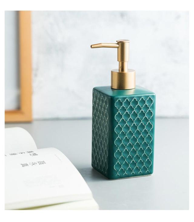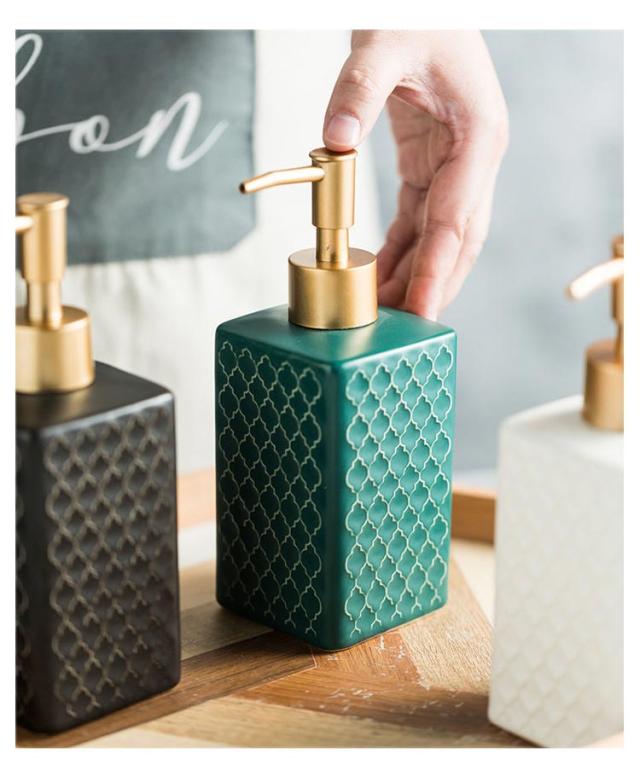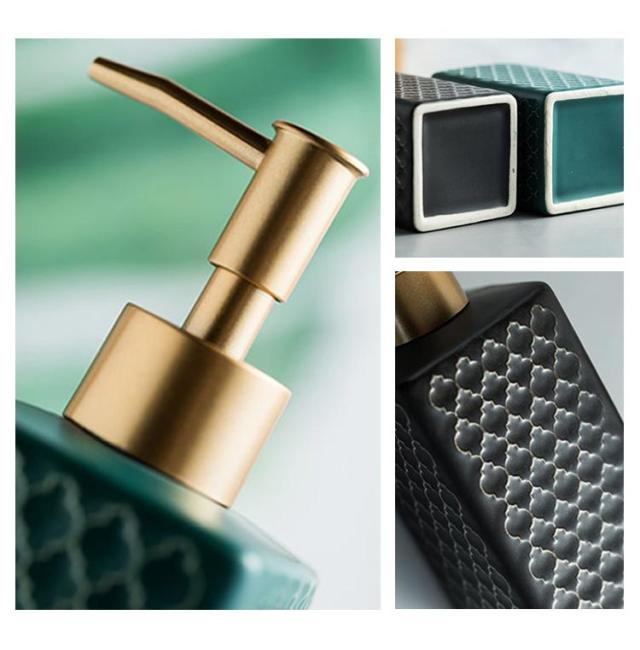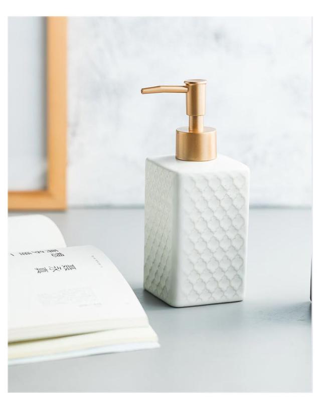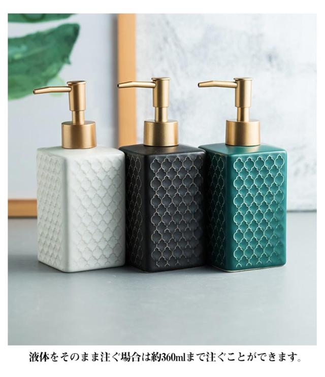 ディスペンサー 陶器 北欧 360ml ソープポンプ ハンド ソープディスペンサー 詰め替えボトル 角型 ダイヤ柄 シャンプー コンディショナー ボディソープ ボトル バスグッズ セラミック ゴールド プッシュ