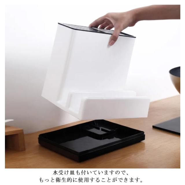 | 様々な包丁、ナイフが収納できるおしゃれな多機能包丁立てスタンドです。 また、まな板、フォーク、スプーン、お箸、鍋蓋なども入れる事が出来る。 環境に優しいPP樹脂を採用し、耐久性があり、防カビ性、抗菌性に優れた。 水受け皿も付いていますので、もっと衛生的に使用することができます。 取り外し可能なデザインなので、お手入れも簡単です。 | |