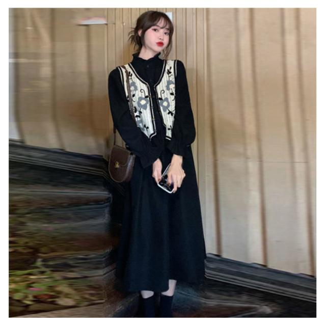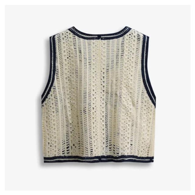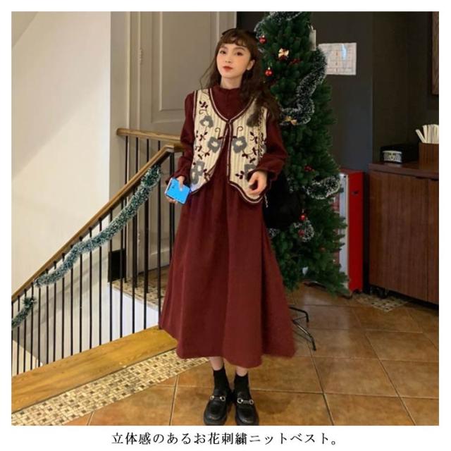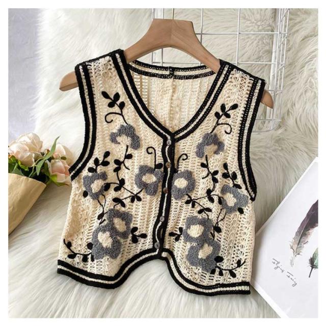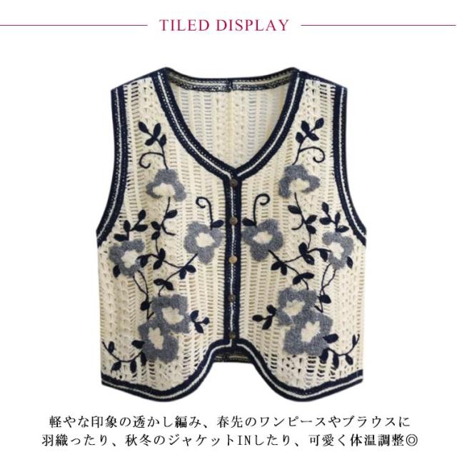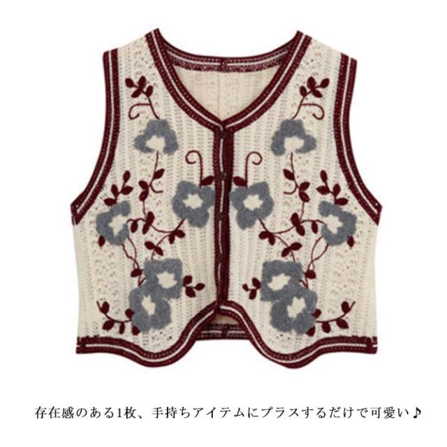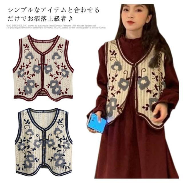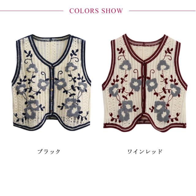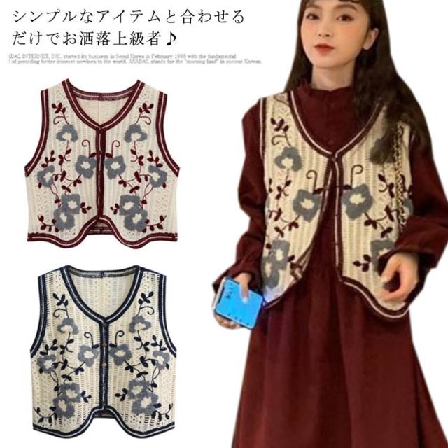 【送料無料】 ニットベスト 透かし編み Vネック 前開き ノースリーブ トップス 花柄 刺繍 レディース ショート丈 春秋 森ガール 韓国ファッション