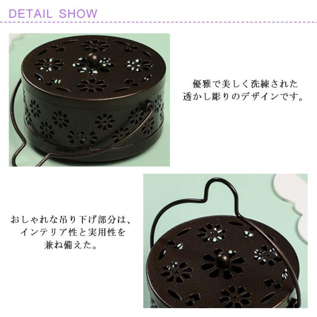 | スチール製蚊取り線香入れ 優雅で美しく洗練された透かし彫りのデザインです。 スチール製で丈夫で長持ち、また不燃性で耐熱性があり、蓋付きで安心安全です。 透かし彫りのデザインは、蚊取り線香の火が消えるのを防ぎ、煙の拡散を早めることができます。 おしゃれな吊り下げ部分は、インテリア性と実用性を兼ね備えた。 秋冬は小物入れとしてお部屋のインテリアに、 春夏は実用的な蚊取り線香入れとしてご活用いただけます。 | |