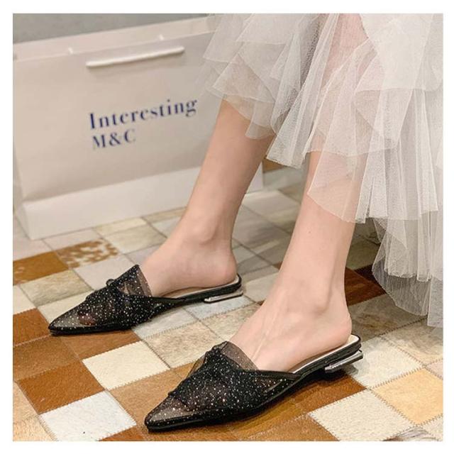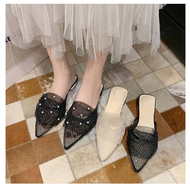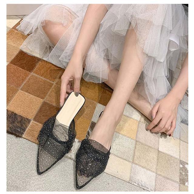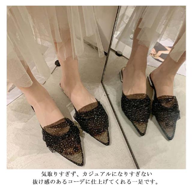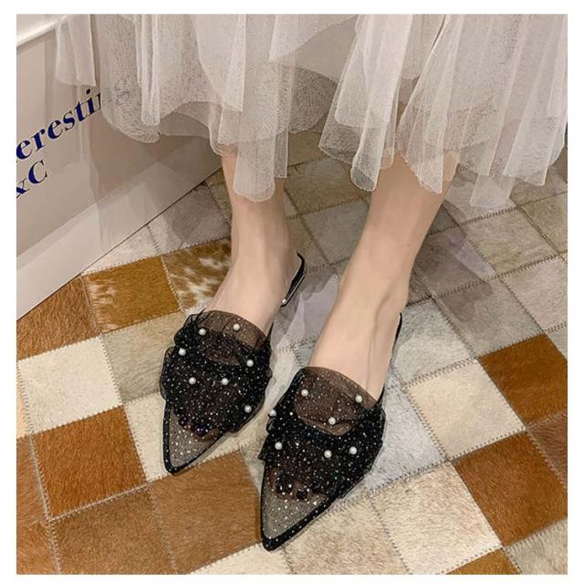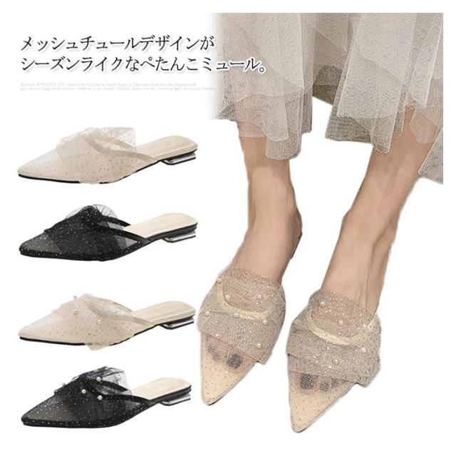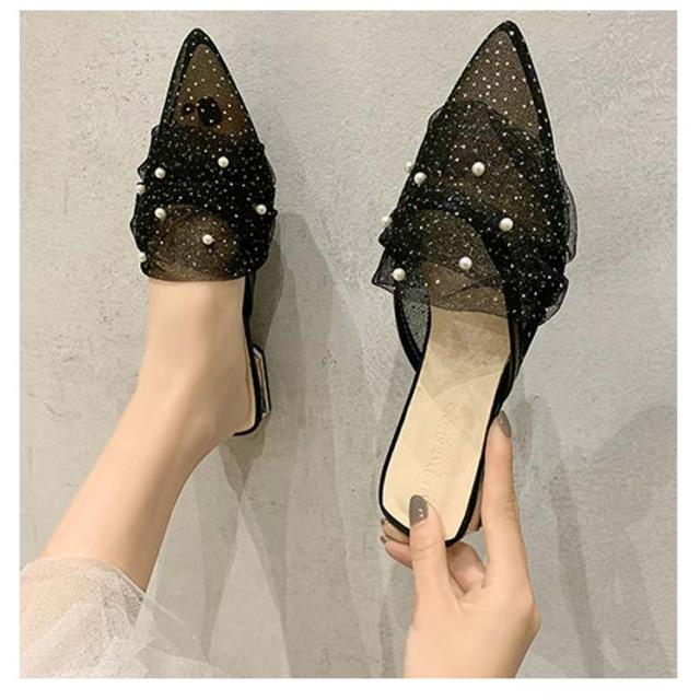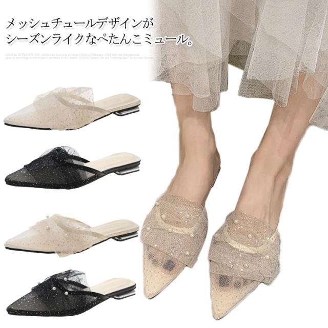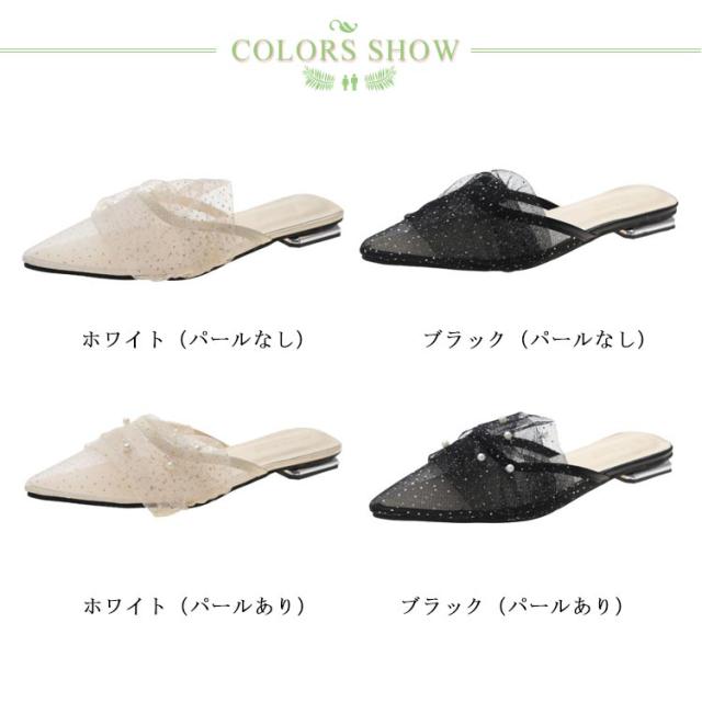 ミュール サンダル フラット 春夏 通勤 パール ギャザー 結婚式 パーティー ポインテッドトゥ レディース 華奢 ぺたんこ 美脚 韓国風 きれいめ 大人 二次会 ブラック グリーン ピンク 歩きやすい 小さいサイズ