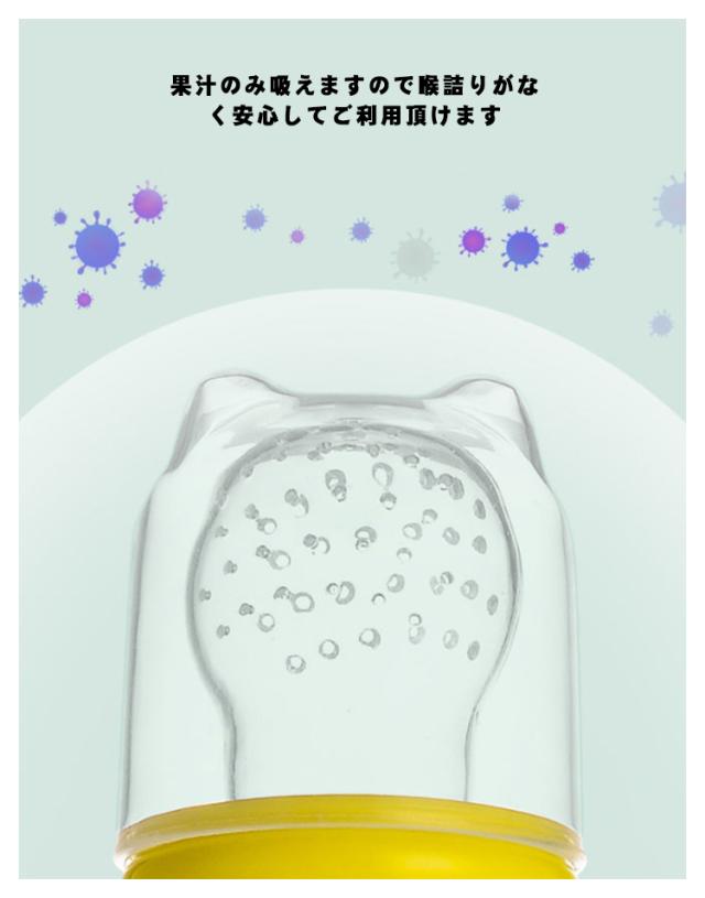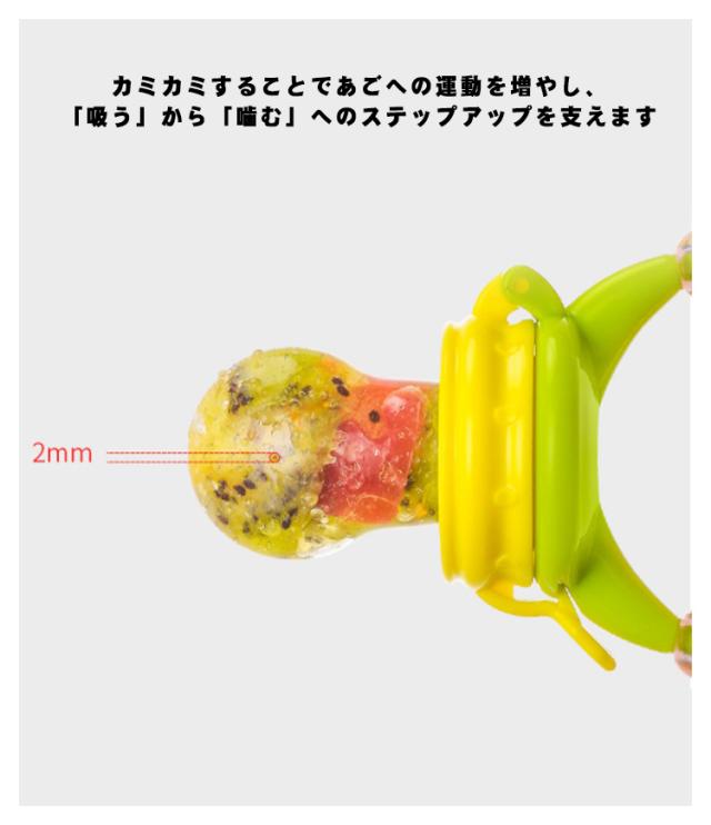 | 離乳食や果物を入れてお食事フィーダー 柔らかいシリコンサックはカミカミしたい赤ちゃんにぴったり。 カミカミすることであごへの運動を増やし、「吸う」から「噛む」へのステップアップを支えます おしゃぶりが苦手な赤ちゃんも楽しくおしゃぶりが出来ます、おしゃぶりの中にフルーツなどを入れるだけ!! キャラクター型持ち手はシリコン製で歯固めとしても 果汁のみ吸えますので喉詰りがなく安心してご利用頂けます | |