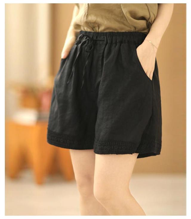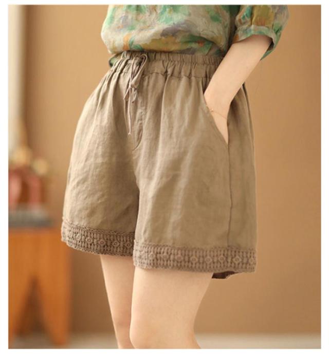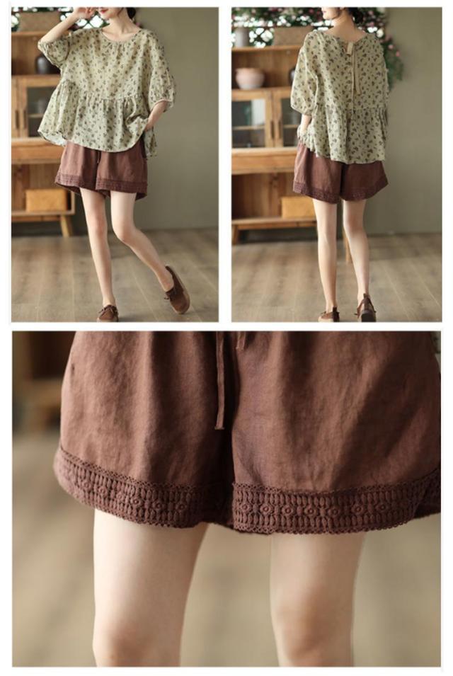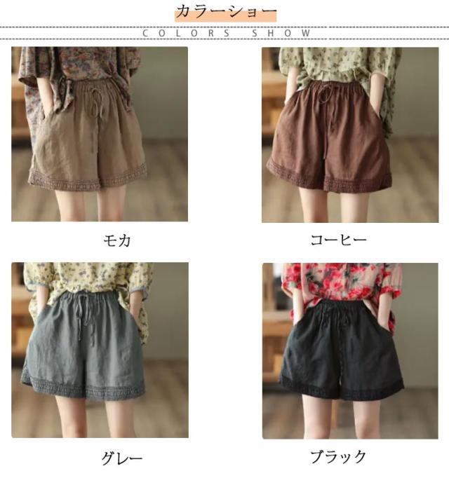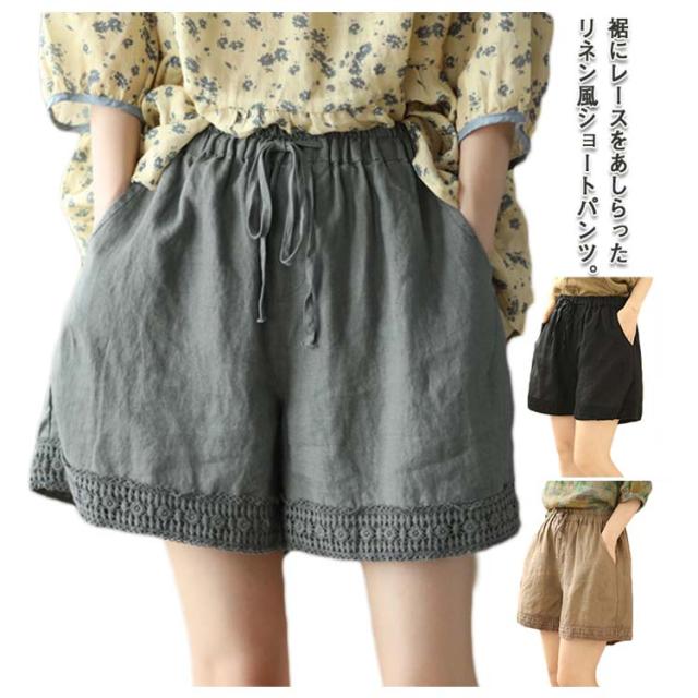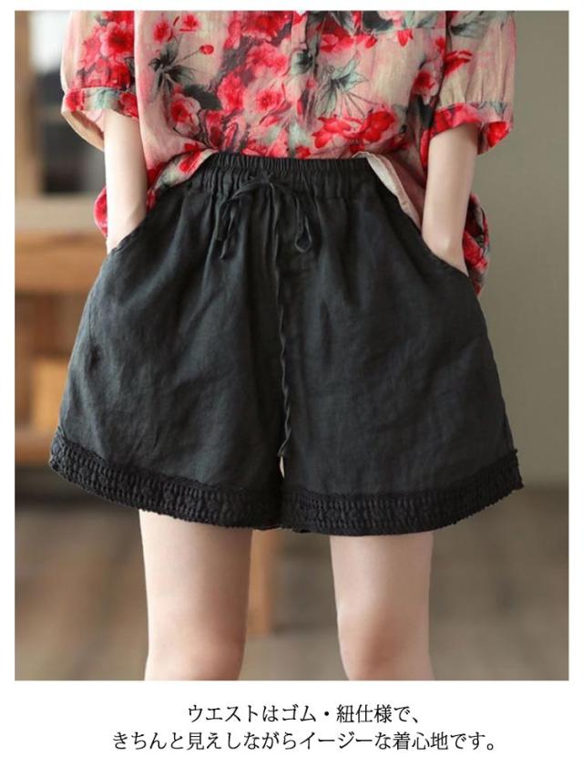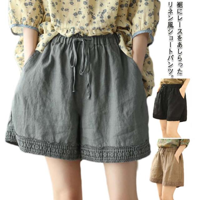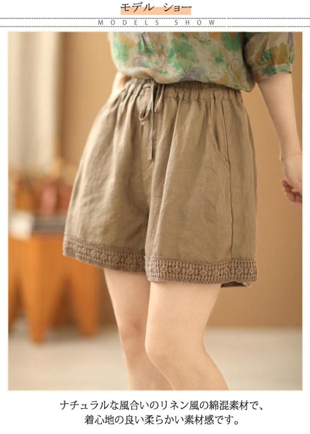 ショートパンツ レディース リネン風パンツ 短パン ワイドパンツ ナチュラル 裾レース 無地 ウェストゴム 綿 コットン イージーパンツ 薄手 涼しい ゆったり 大きいサイズ 女性用 シンプル かわいい 部屋着 ルームウェア 春 夏 夏服 送料無料