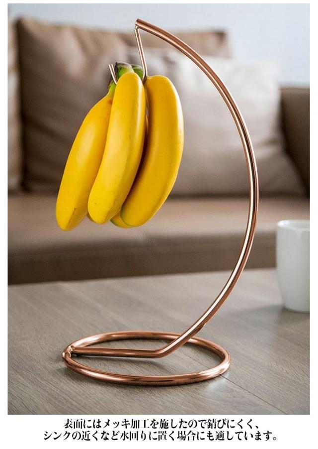 | スタイリッシュなバナナスタンド! バナナを1房保管できる商品で、吊るすことで黒ずみや傷みが進みにくくなります。 表面にはメッキ加工を施したので錆びにくく、シンクの近くなど水回りに置く場合にも適しています。 様々なインテリアに馴染みやすいシンプルですっきりしたデザインです。 | |
