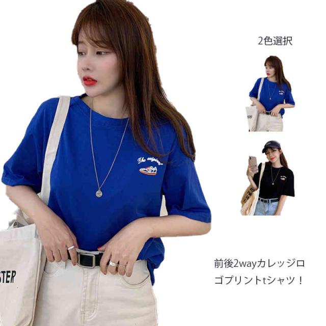 前後2wayカレッジロゴプリント! tシャツ レディース トップス 半袖 プルオーバー Tee ロゴTシャツ ロゴT ロング ロゴ プリント 夏 春 カジュアル おしゃれ 大きいサイズ ゆったり 体型カバー オーバーサイズ 韓国 ファッション