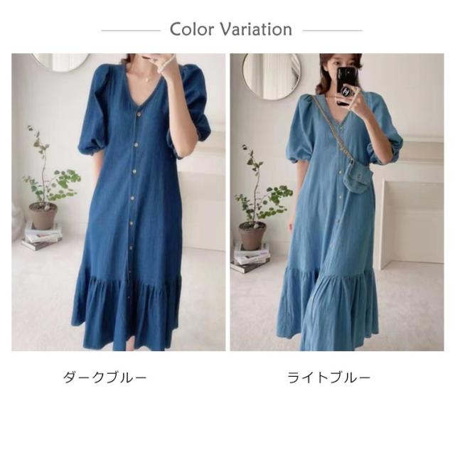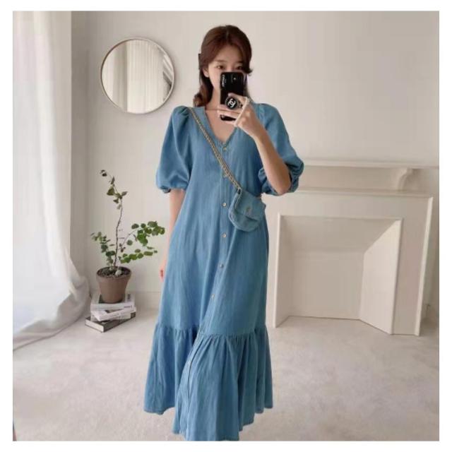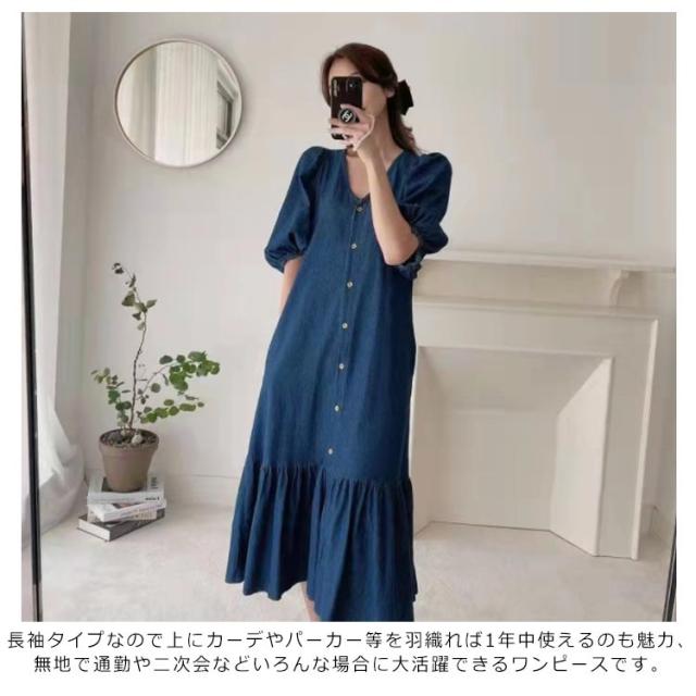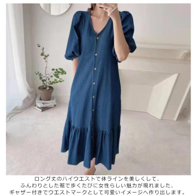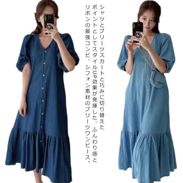 送料無料 レディース ワンピース 半袖 春夏ワンピース デニム Vネック パフスリーブ シャツワンピース マーメイドライン カジュアル OL 通勤 デニムワンピース 膝丈ワンピース マーメイドライン 大人 きれいめ 薄手ワンピ お出かけ