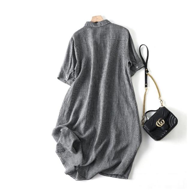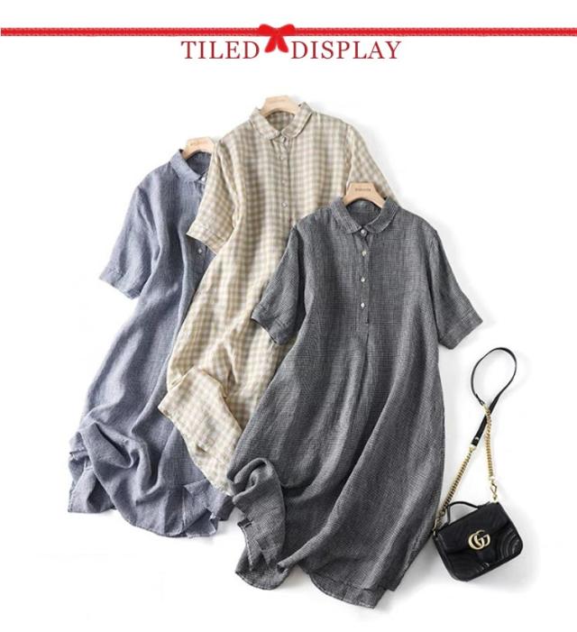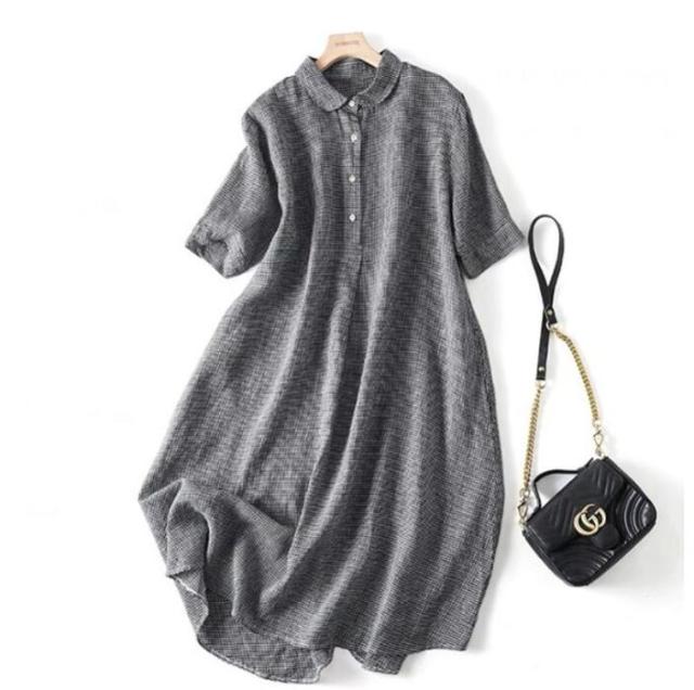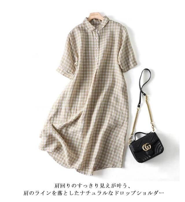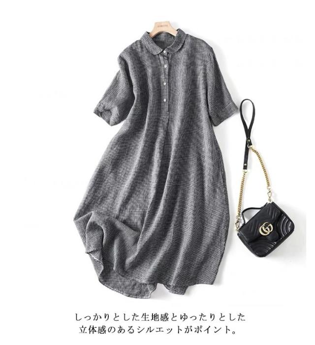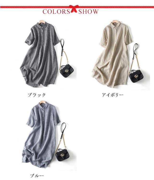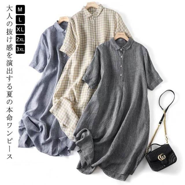 ワンピース 半袖 レディース シャツワンピース ロング リネン調 チェック ロングワンピース チェックワンピース 膝丈 膝下丈 ゆったり 体型カバー 着?せ マタニティウェア カジュアル 大きいサイズ 黒 ブラック ベージュ ブルー